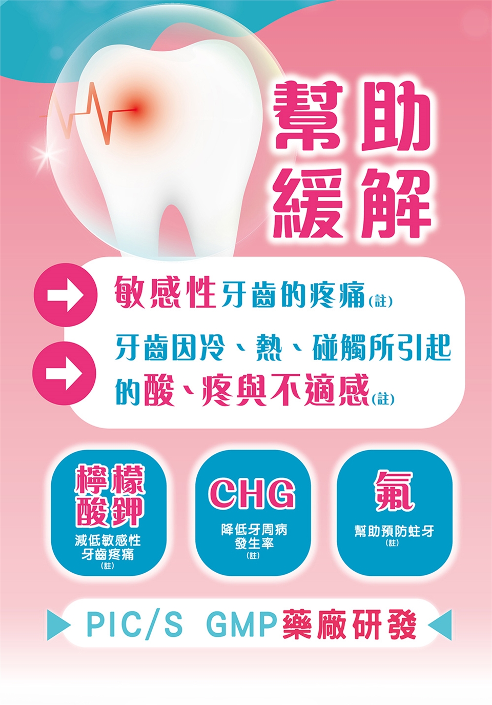 ‧配合正確刷牙習慣,可減低敏感性牙齒疼痛、減少牙齦出血之發生率、降低牙周病發生率、幫助預防蛀牙、固齒護齦、保持口氣清新。