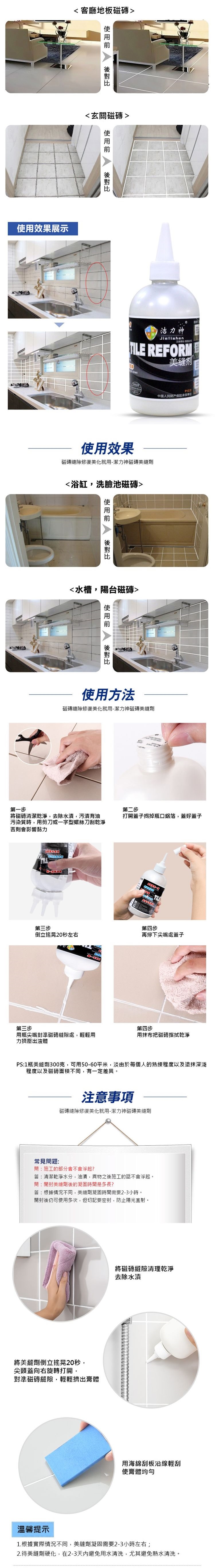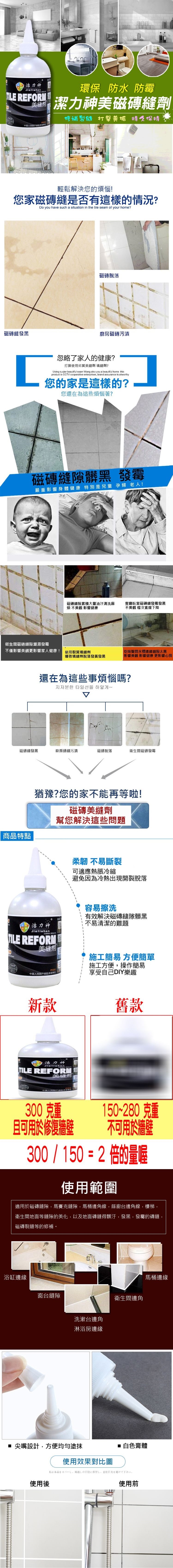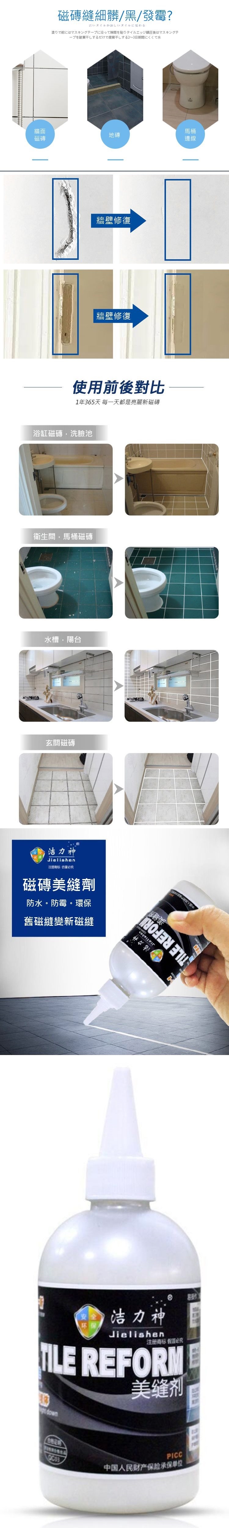 潮濕的氣候,牆角縫隙很容易發霉,黑麻麻汙垢線條,讓房子顯得陳舊不堪!來使用全新升級潔力神美瓷磚縫劑吧!加量為300克並升級除霉效果,可適應熱漲冷縮,不積汙垢易擦洗,超防水防霉,適用於瓷磚、地磚的縫隙處,輕鬆DIY施工,飽滿的潔白色讓房間更顯得亮麗美觀!