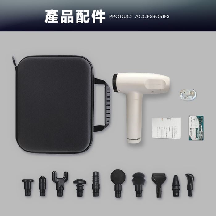 包裝內容物:主機x1/按摩頭x10/USB線x1/收納包x1/說明書x1/保固卡x1