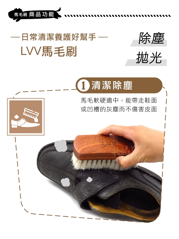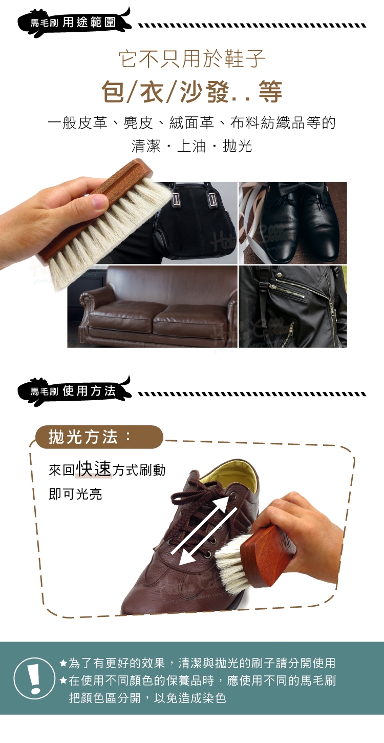 1.清潔除塵:馬毛軟硬適中,能帶走鞋面或凹槽的灰塵而不傷害皮面