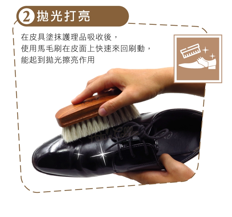 使用馬毛刷在皮面上快速來回刷動,能起到拋光擦亮作用