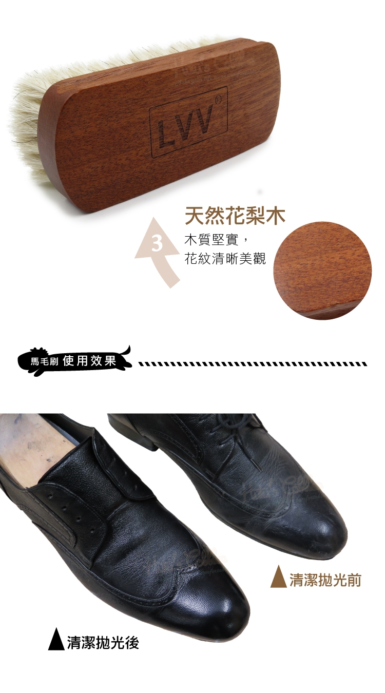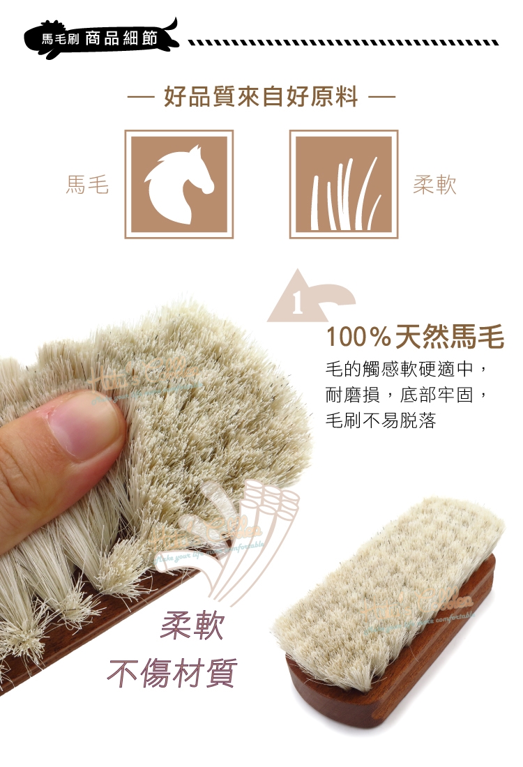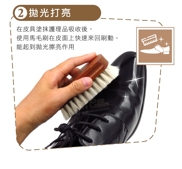 1.清潔除塵:用馬毛軟硬適中,能帶走鞋面或凹槽的灰塵而不傷害皮面