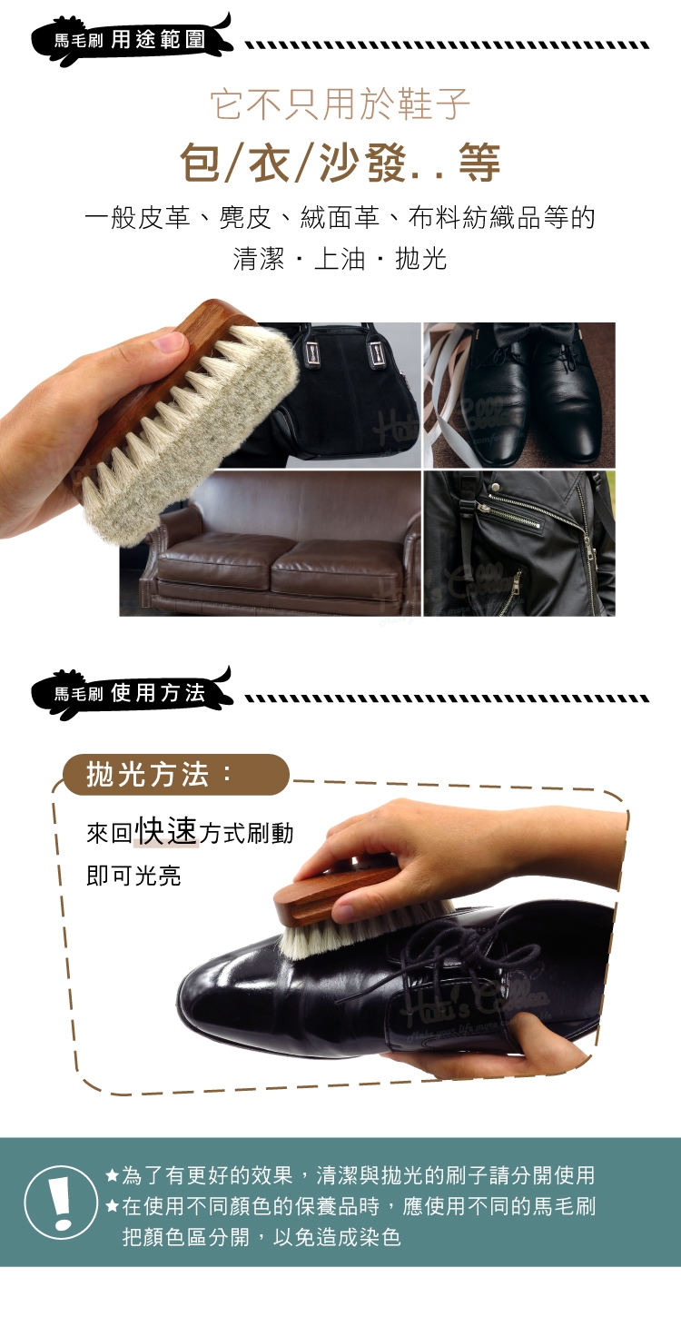 使用馬毛刷在皮面上快速來回刷動,能起到拋光擦亮作用