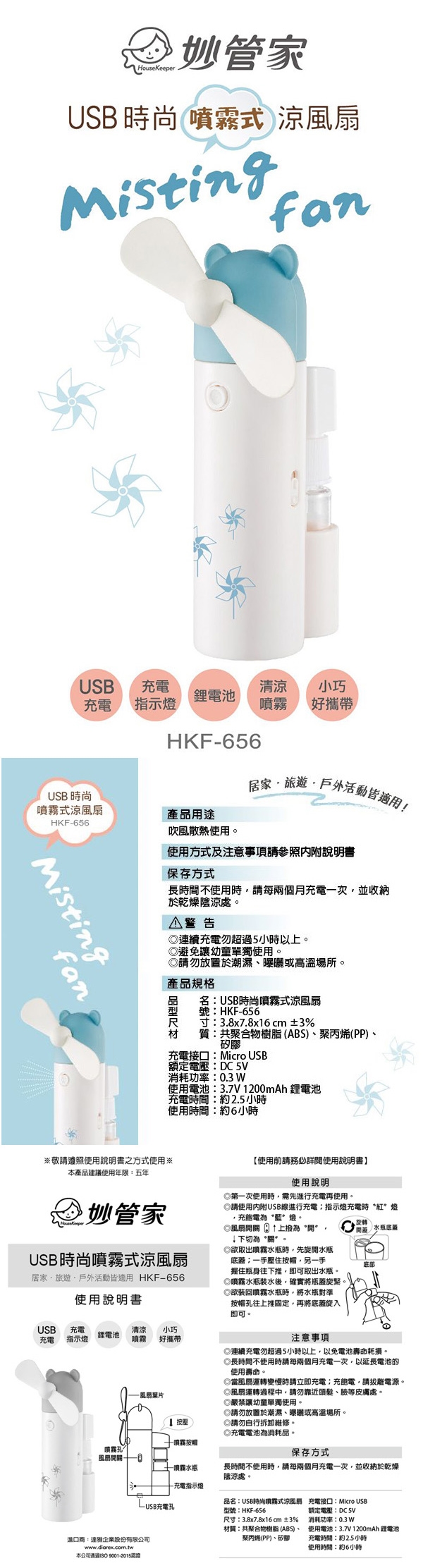 妙管家 USB時尚噴霧式涼風扇 HKF-656