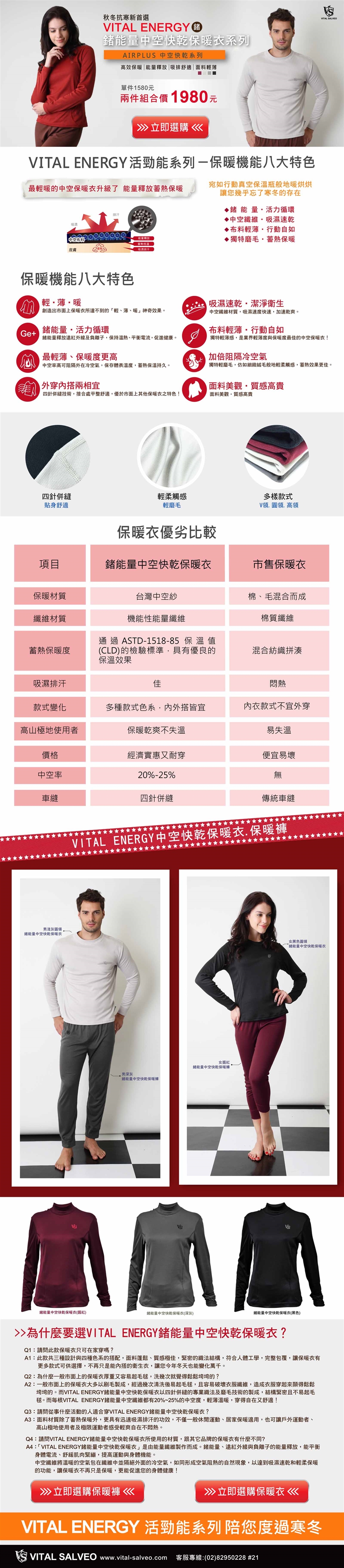 「VITAL ENERGY鍺能量中空快乾保暖衣」的成分為鍺紗與中空紗結合。鍺紗釋放能量並保持身體的溫熱感,而中空纖維將溫暖的空氣包在纖維中並隔絕外面的冷空氣,如同形成空氣阻熱的自然現象,以達到吸濕速乾和輕柔保暖的功能。而在這一季的商品設計上,均採用高密度四針併縫車法,這樣的技術主要在於讓您在穿的時候,減少與縫線的摩擦,讓衣服完美貼合,使您穿的舒適又保暖,絕對是品質的保證。