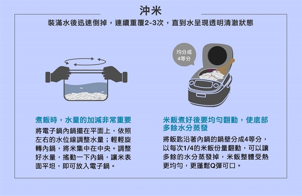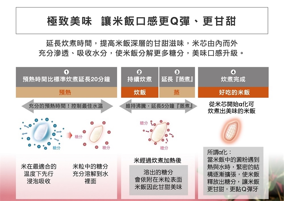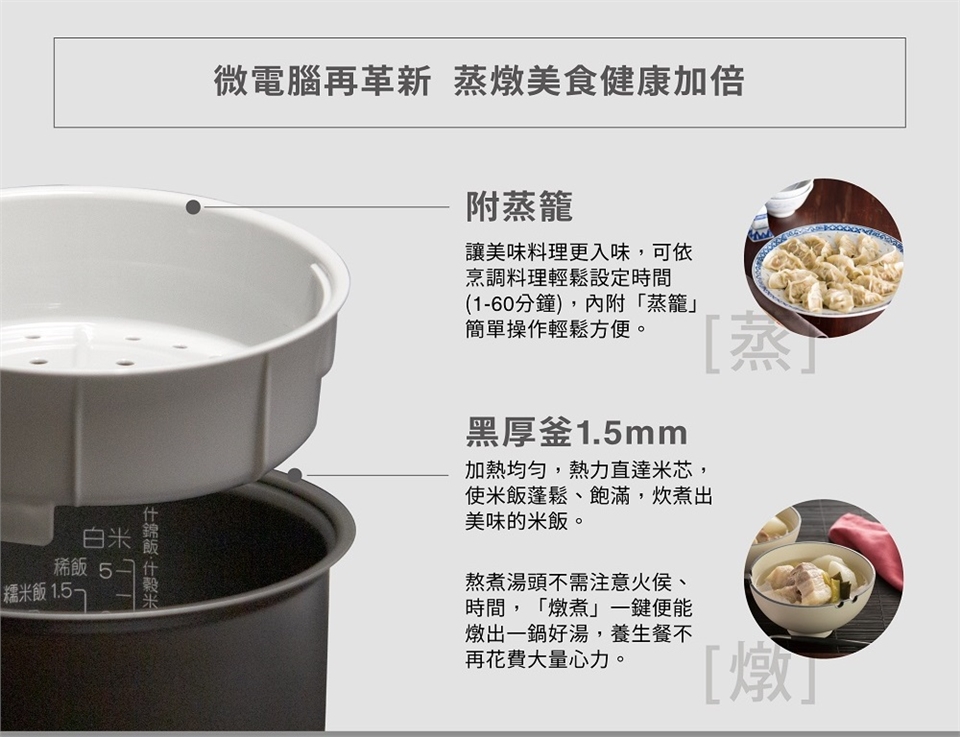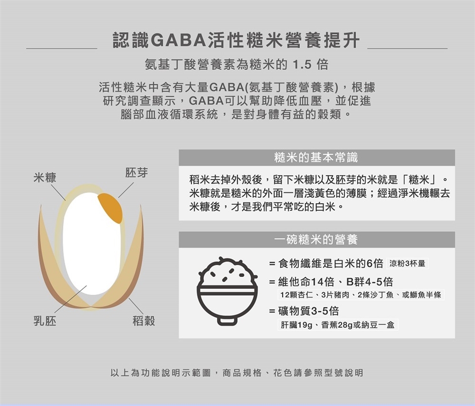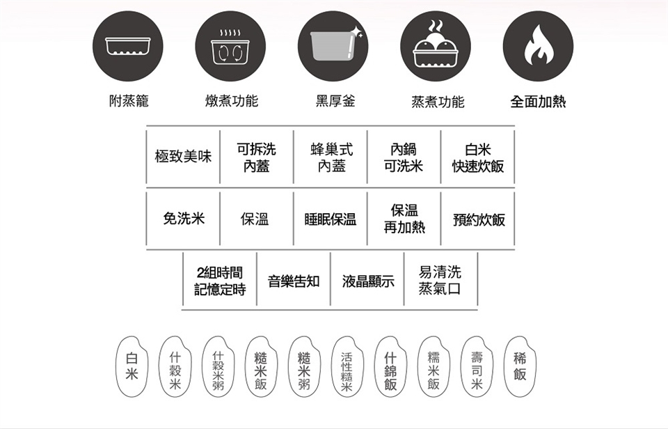 (1) 豐富的健康選擇,可炊煮「糙米、活性糙米、糙米粥、什穀米、什穀米粥」。