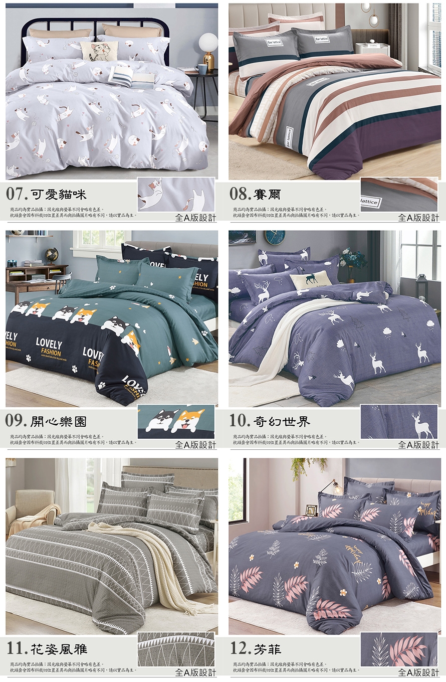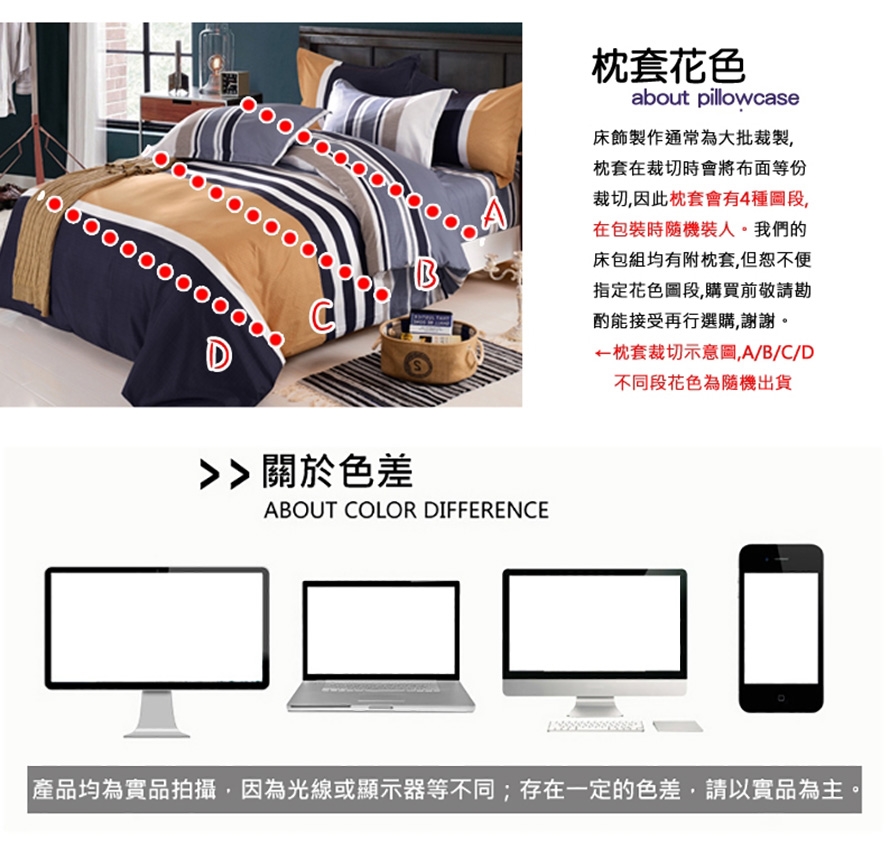 枕套花色不一定會與花色展示圖中一致,下單前請考量是否能接受此裁製方式。台灣製平價床組通常都是這樣裁製,請確定接受再行選購,謝謝您。