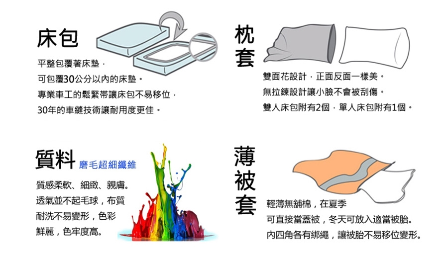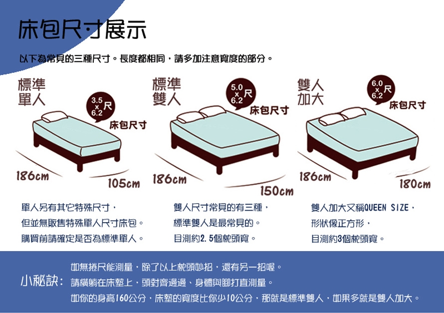 選購時請詳確尺寸,以便選購到與您床墊相符合的床包。