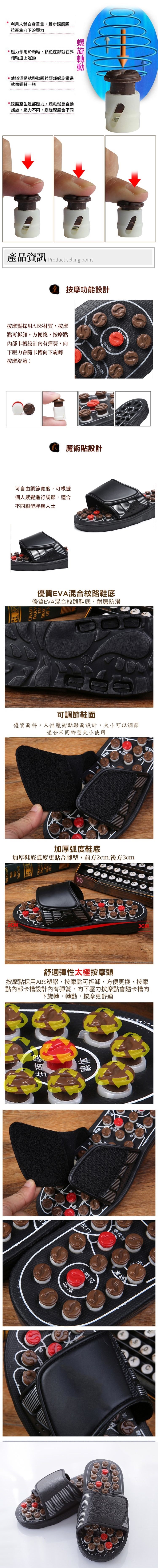 舒適穴道彈力按摩拖鞋,太極迴旋轉動按摩腳底,養身保健必備,防滑耐髒耐磨。選用柔軟的EVA材質,曲折摺疊不傷腳。腳跟加厚設計,緩衝腳跟所受到的衝擊力,保護您的雙腳安全輕鬆地走路。魔鬼貼設可自由調整寬度,抓地力更強,一步步都腳踏實地!讓拖鞋不只是方便,更能舒適呵護您的腳!不管是送人或自用,居家或戶外皆宜喔!