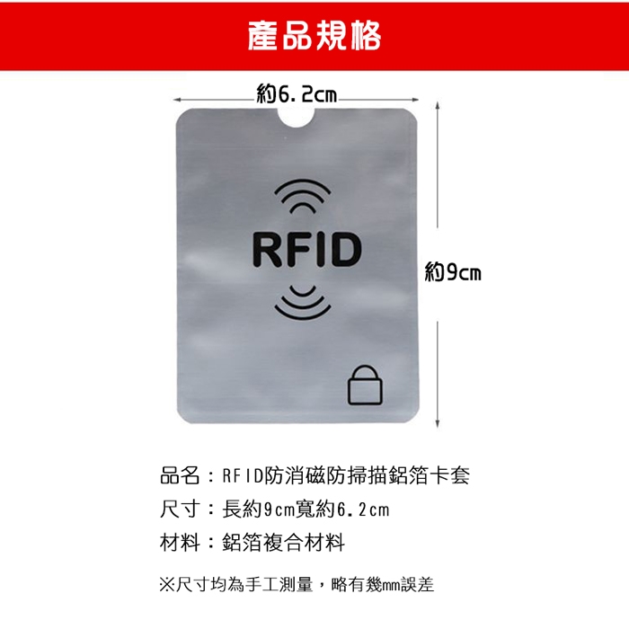 商品詳細介紹 RFID防消磁防盜錄信用卡鋁箔卡套(2入)本商品兩入一組 。出國旅行旅遊時,隨身信用卡等重要證件卡片得妥善保管。RFID 屏蔽防護有效阻絕未經允許的個資讀取,避免被截取破解盜刷。外型如一般鋁箔卡套,將卡片裝置卡套內後仍可置放於皮夾內,方便使用,是外出防護個資安全的最佳選擇。 使用方法說明 無 注意事項 無