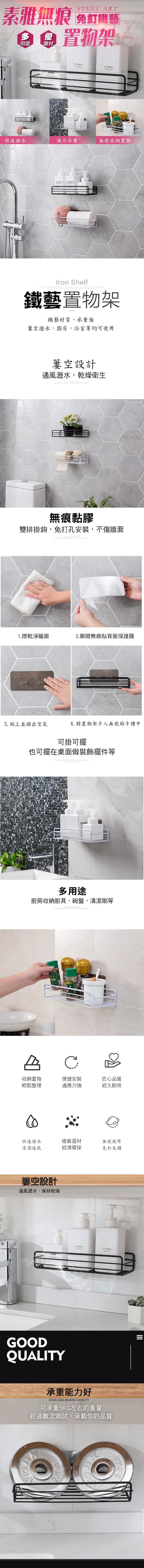 免釘鐵藝素雅無痕置物架,鐵藝材質製成,穩固耐用,承重力強!安裝方便,輕鬆收納各式瓶瓶罐罐和生活雜物,環境更整齊又美觀!不管是廚房、浴室或是臥室等居家環境都可放置喔!