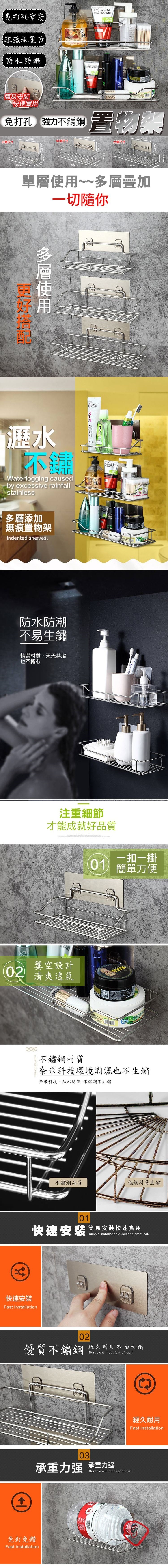 免打孔不銹鋼多用置物架,優質不鏽鋼材質,防水防潮,護欄設計,東西擺放安全,不易掉落,採用強力無痕貼,免釘鑽牆面,安裝簡易牢固,拆除不留痕,且承重力佳!廚房、衛浴空間皆適用,將瓶瓶罐罐收納整齊