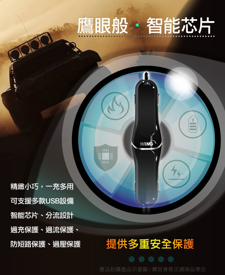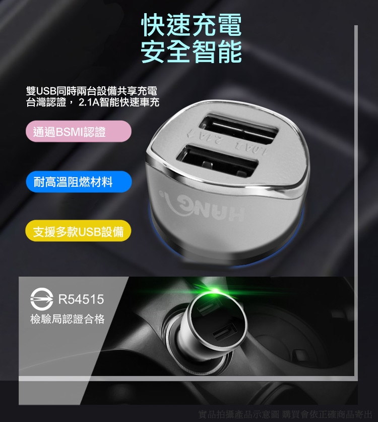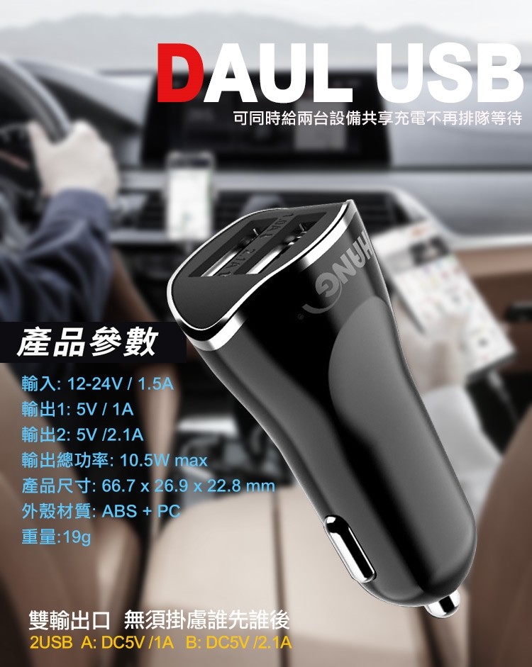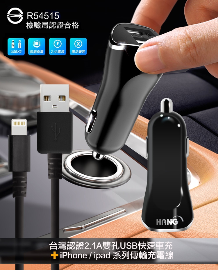 HANG 台灣認證2.1A雙孔USB快速車充+iPhone/iPad系列傳輸充電線-黑色組