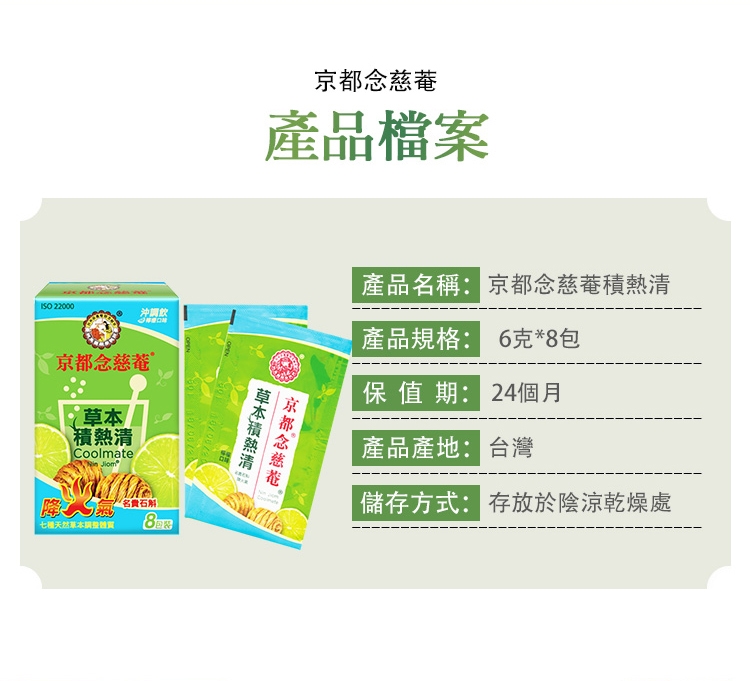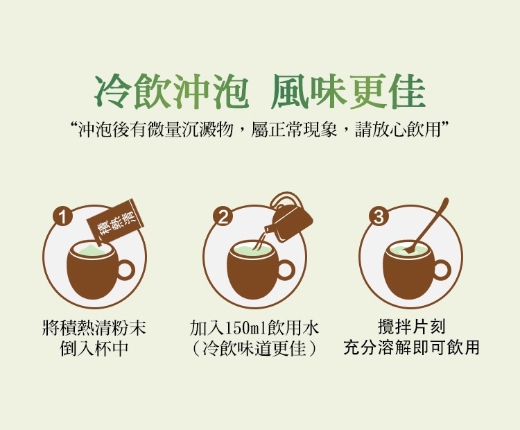 商品詳細介紹 體驗說明 不可體驗 使用方法說明 將1包沖泡包放入150毫升水中,輕輕攪拌,即可飲用。冷水或溫水均可,冷飲味道更佳。經常飲用,有助從內調整體質。沖水後有些許沉澱物乃正常現象。 注意事項 開封後請將瓶蓋緊壓,並置於陰涼乾燥處。