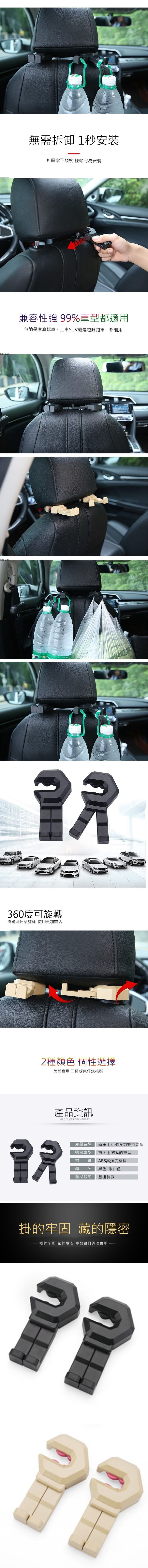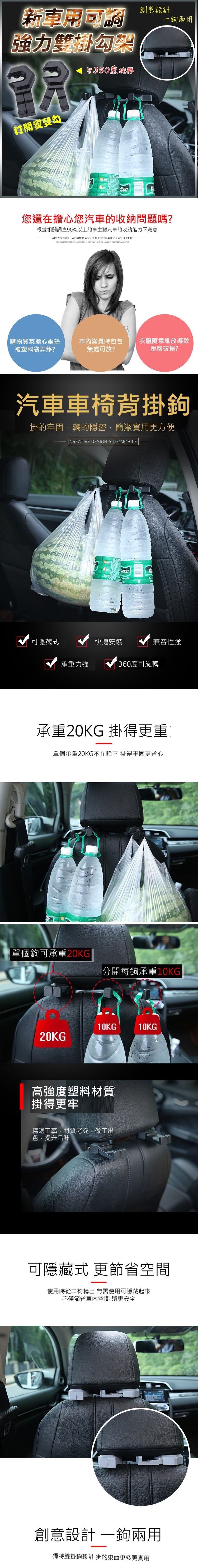 2秒安裝簡易免拆枕頭,新車用可調強力雙掛勾架,可調控雙掛勾設計,耐重更強力,可隱藏掛勾需要時再轉出掛物品!塑膠保護設計,防刮耐用不易變形,安裝不傷您愛車!高品質塑料高承重力,流線設計,美觀大方!米白色/黑色二色,可搭配車內裝顏色!