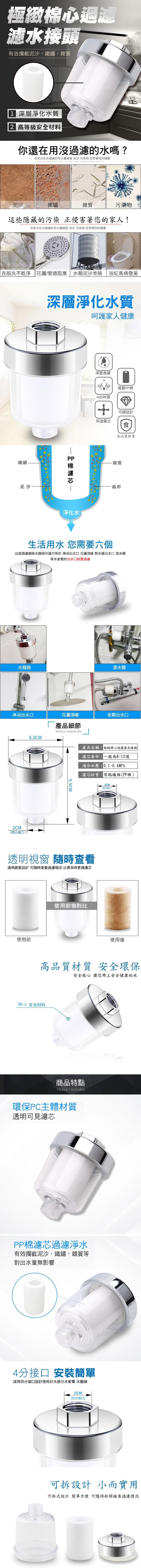極緻棉心過濾濾水接頭,全效淨化、呵護健康!使用國際標準4分通用接口,即裝即用、便捷更換~內部環保ABS材質,無毒無害,隔熱效果佳,可強效去除水中雜質,減少水汙染對皮膚的刺激和感染,保護全家人的健康,讓你用水更安心~快來感受一下柔膚沐浴的新體驗吧!