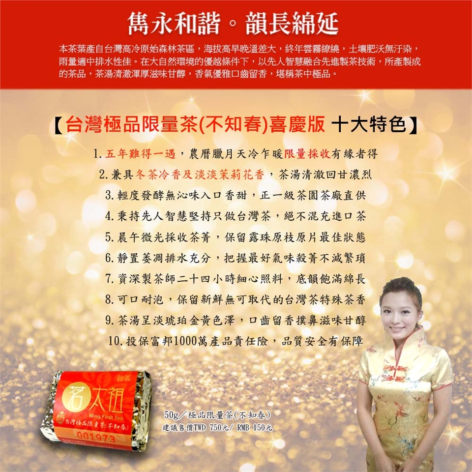 【茗太祖】台灣極品限量編號茶 不知春真空喜慶版(50g/包)x4