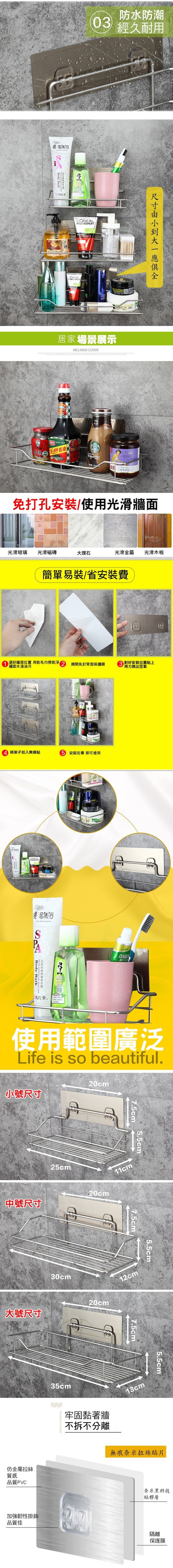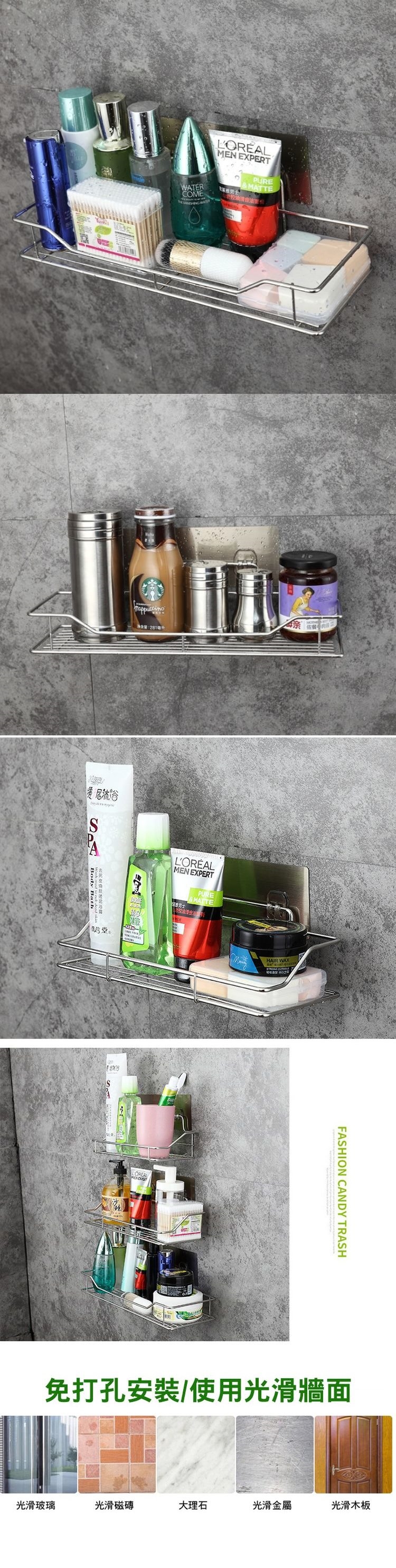 免打孔不銹鋼多用置物架,優質不鏽鋼材質,防水防潮,護欄設計,東西擺放安全,不易掉落,採用強力無痕貼,免釘鑽牆面,安裝簡易牢固,拆除不留痕,且承重力佳!廚房、衛浴空間皆適用,將瓶瓶罐罐收納整齊