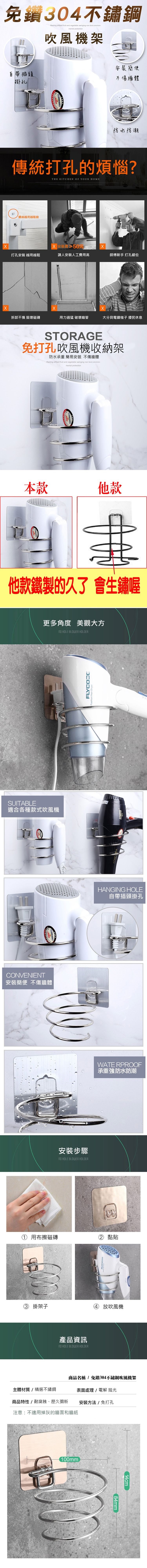 每天使用的吹風機,放在顯眼的地方再好不過了!免鑽304不鏽鋼吹風機架,新升級為304不鏽鋼材質比舊款鐵製的還不會生鏽喔,免釘免鑽,即貼即用,除了可掛吹風機外,還帶有插頭卡位跟掛勾,放在浴室、房間,享受如同飯店般的方便~