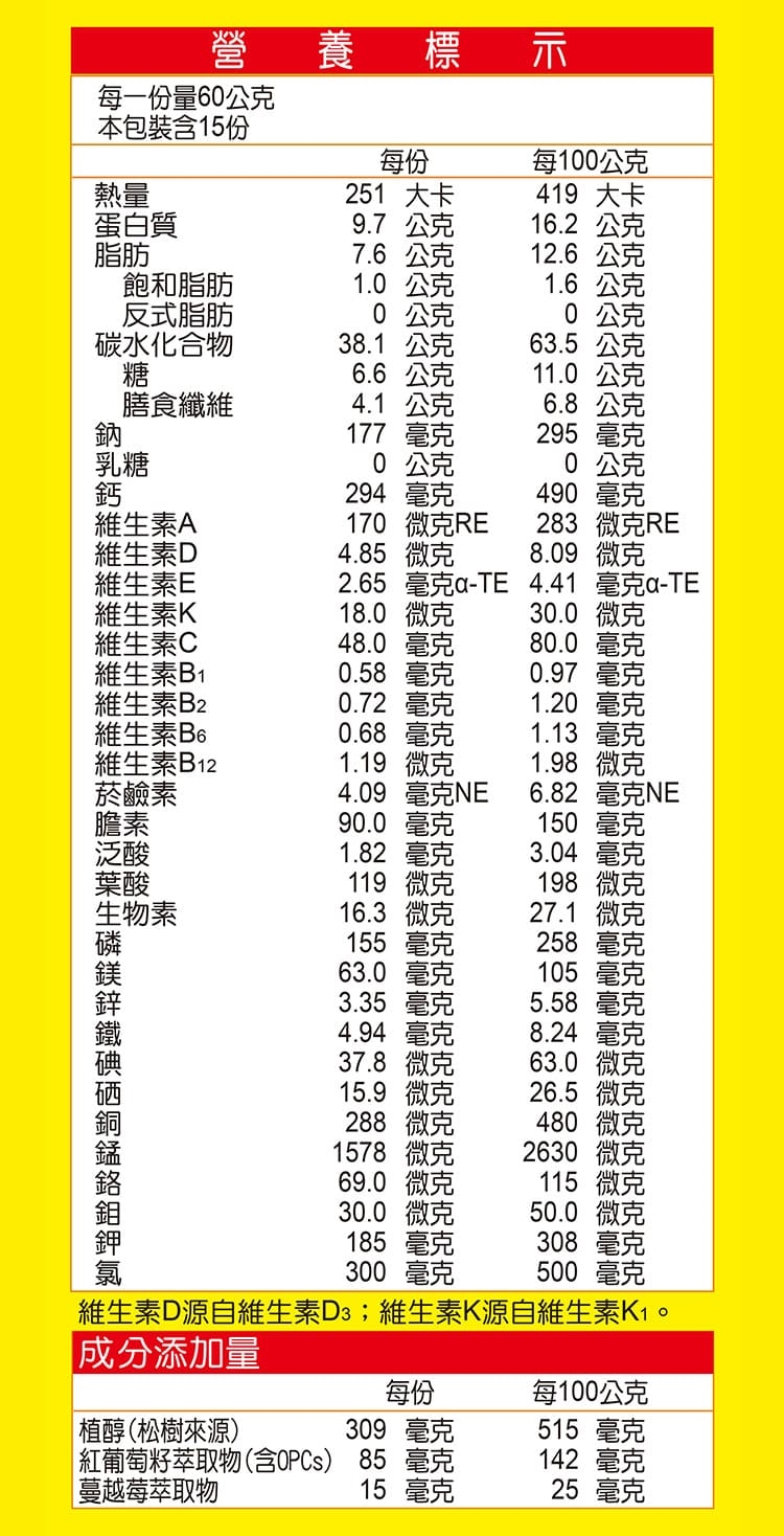 ●每日1500大卡(約6份) 可達到衛生福利部國人膳食營養素參考攝取量(DRIs)之每日礦物質與維生素建議。(氟除外)