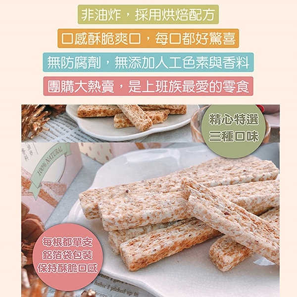 商品資訊 | ◆非油炸,採用烘焙配方。 ◆口感酥脆爽口,每口都好驚喜。 ◆每一根都是單支鋁箔袋包裝,保持酥脆口感。 ◆無防腐劑,無添加人工色素與香料。 ◆團購銷量超讚,是上班族最愛的零食。 |