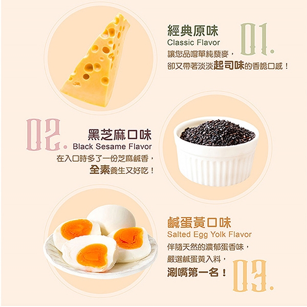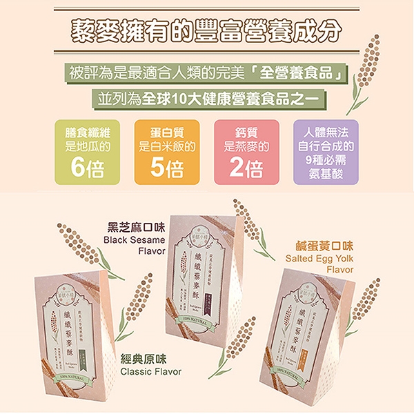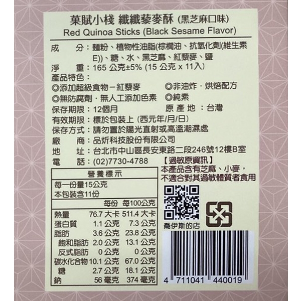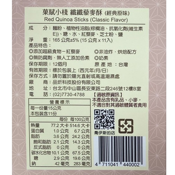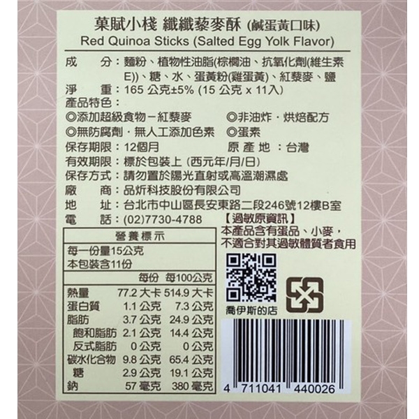 商品規格/成分 | ◆規格:一盒有11支藜麥酥,1支約15克重,淨重165公克 ◆成份:以藜麥為主成分的健康零食 1、原味:麵粉、植物性油脂(棕櫚油、抗氧化劑(維生素 E))、水、糖、紅藜麥、芝士 粉、鹽。 2、黑芝麻口味:麵粉、植物性油脂(棕櫚油、抗氧化劑(維生素 E))、水、糖、黑芝麻、紅藜麥、鹽。 3、鹹蛋黃口味:麵粉、植物性油脂(棕櫚油、抗氧化劑(維生素 E))、水、糖、蛋黃粉(雞蛋黃)、紅藜麥、鹽。 |