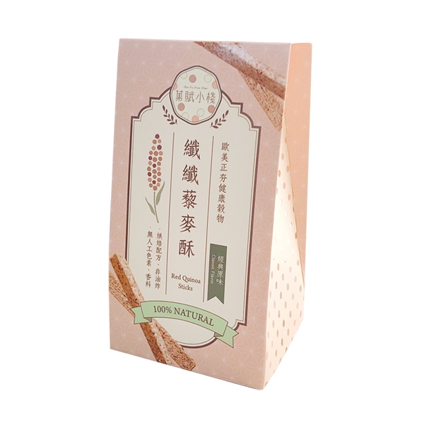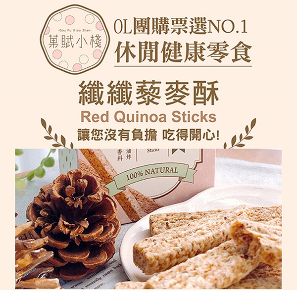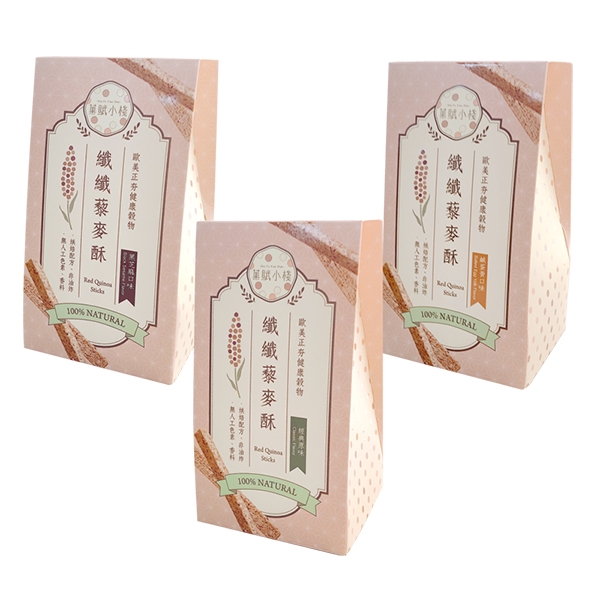 商品問答 | Q:什麼是藜麥酥?跟一般零食有何不同? A:藜麥本身就是很健康的成分,不僅低熱量且富含膳食纖維,製作過程沒有油炸,採用烘焙配方,且沒有防腐劑,沒有添加防腐劑與人工色素香料,口感接近方塊酥但又清爽許多,要吃零食就是滿足口腹之慾,纖纖藜麥酥絕對可以達到好吃但又健康的期望。黑芝麻口味或全素,也可以滿足吃素的消費者。 Q: 為什麼藜麥酥長期受到上班族的喜愛? A:纖纖藜麥酥採用一根一根獨立包裝鋁箔袋的方式,每次吃可以自己決定要吃幾根,不用怕一開封就得全包吃光,不然就軟掉或不新鮮了!且搭配下午休息的時間泡杯咖啡或茶,酥脆的口感搭配一杯愛喝的飲料,絕對可以稍微放鬆一天的壓力,從味覺上獲得極大的滿足!
