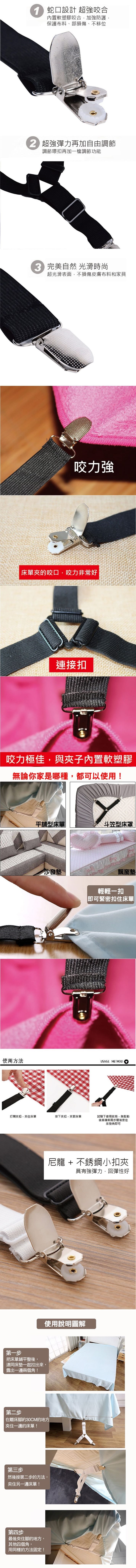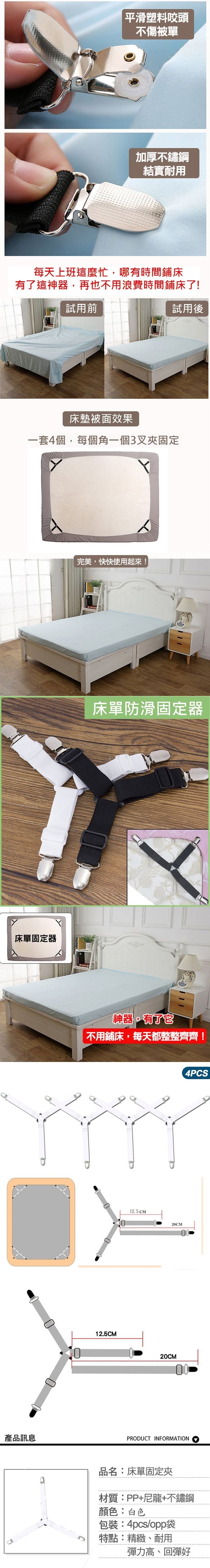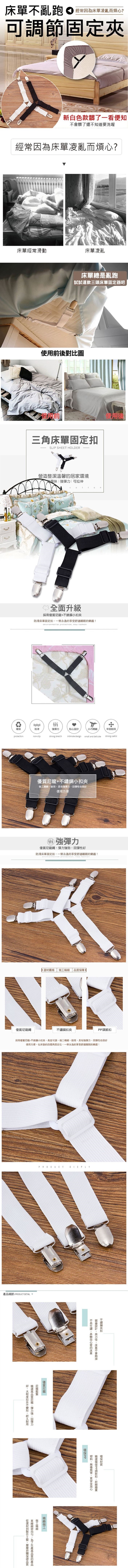 一覺醒來,床單總是凌亂不堪,每天需要重新整理,真是麻煩... 新款的超實用的床單不亂跑可調節固定夾,伸縮帶採白色設計,讓你一眼就知道是否已髒污該清洗了,而不是一直與髒汙共眠,並採用三方強力咬合設計,咬力極佳,與夾子內置軟塑膠,可加強防護,保護布料不易損傷、不易移位,讓你再也不用擔心把床單弄得凌亂不堪了!