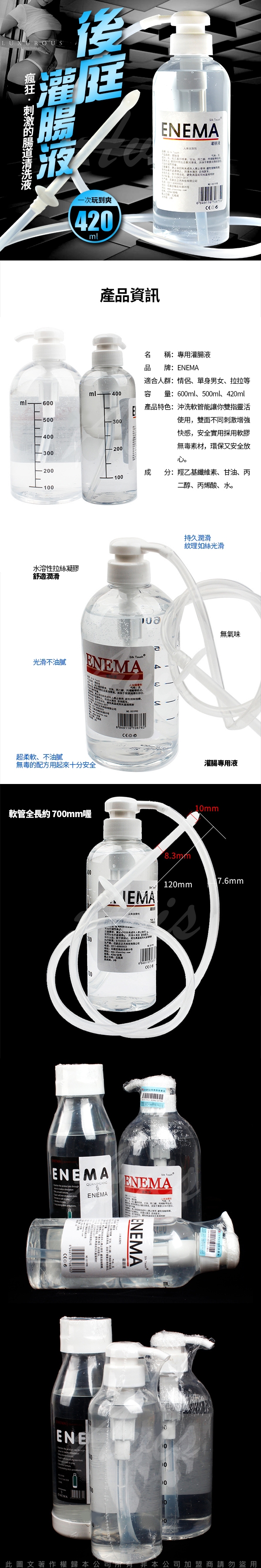 商品詳細介紹 沖洗軟管能讓你雙指靈活使用雙面不同刺激增強快感,安全實用採用軟膠無毒素材,環保又安全放心水溶性拉絲凝膠,舒適潤滑,光滑不油膩 【注意事項】 1、本商品僅供情侶間使用,使用前後請注意清潔衛生 2、請務必在安全、自願、愉悅的前提下謹慎使用【清洗注意事項】 1、本商品使用前以中性清潔劑清洗,切勿以揮發性之清潔劑擦拭【收納注意事項】 1、本商品請收納於陰涼之處所,避免陽光直接曝曬、高溫、潮濕之處所 2、用後請清洗並擦拭後再進行收.商品內容:ENEMA 後庭肛交情趣 灌腸液 潤滑液 420ml.商品尺寸/容量:軟管全長約700mm/420ml ★本產品為個人私密性用品,一經〝拆封〞或〝使用〞即無法接受退換貨,不便之處敬請見諒★★本商出貨時皆以隱密之包裝方式出貨,外包裝不會出現任何情趣商品字樣,敬請安心選購★ 使用方法說明 無 注意事項 無