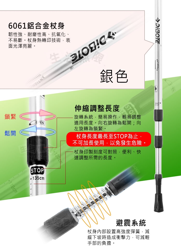 2.手杖除了做健走、徒步及登山用之外,請勿作為其他用途。