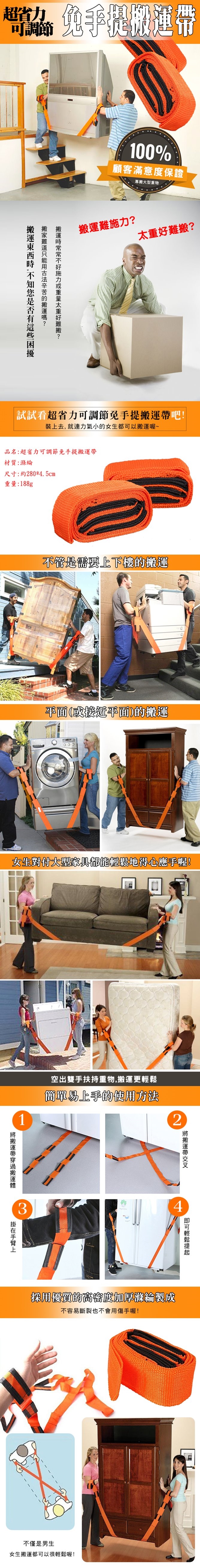 搬家難道只能用古法辛苦的搬運嗎?不不不~有了超省力可調節免手提搬運帶就可以不用那麼辛苦啦!力學原理設計,在搬運東西的時候可以省力70%左右~防止碰撞並且更加輕鬆安全喔!