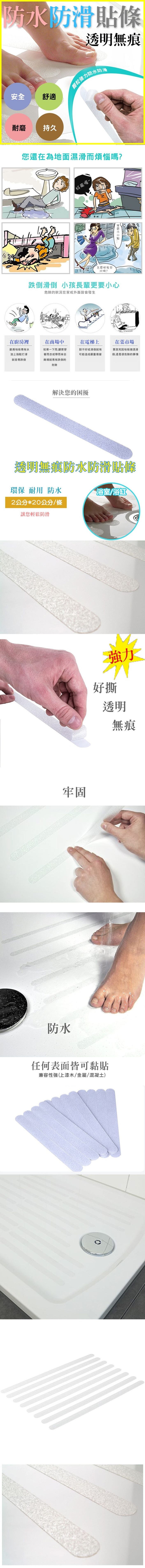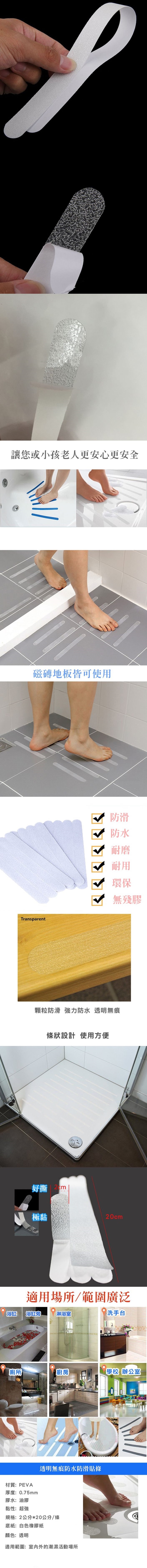 透明無痕防水防滑貼條,防滑材質,防水防滑,不磨腳!黏性強貼合佳,不滑動,使用安全有保障!不易卡垢,不發霉,刷子輕輕刷洗,即可恢復乾淨!浴室進出口、馬桶前方廚房等區域都適用!條狀設計,使用方便,適用範圍廣泛,DIY方便又快速!