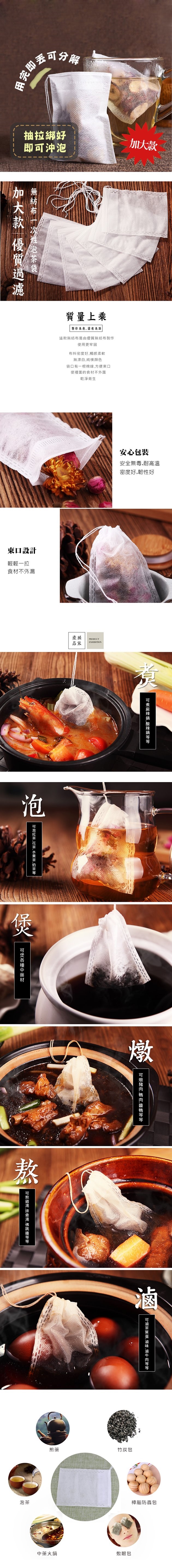 加大款無紡布一次性泡茶袋,採用優質無紡布材質,防潮、抗菌、健康無毒,用完即丟可分解,安全又環保~ 只需將茶葉放入,抽拉綁好,即可沖泡!亦可當滷煮、煲湯、熬藥等用途使用,小東西,多用途,超好用~ 一包100入大份量