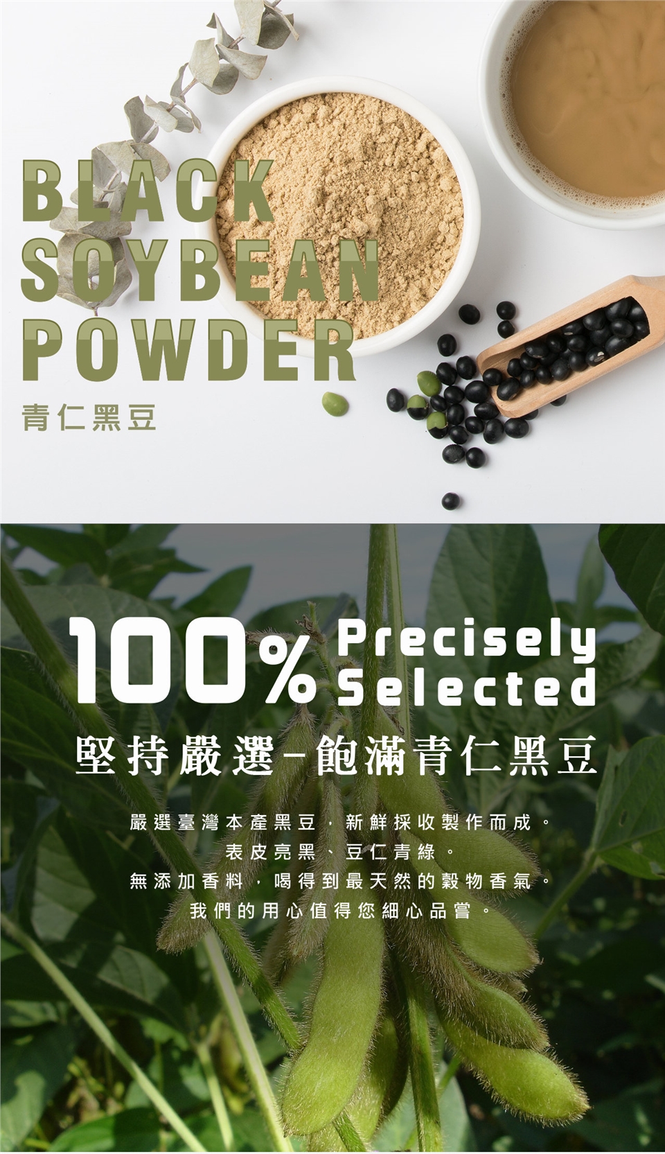 嚴選青仁黑豆,表皮亮黑、豆仁青綠