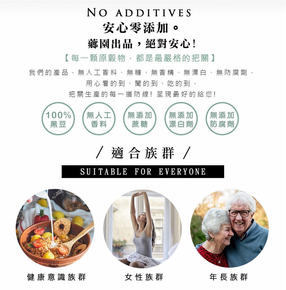 為純100%青仁黑豆無添加其他穀類粉,亦不添加香料、無色素、無添加糖精、無防腐劑。