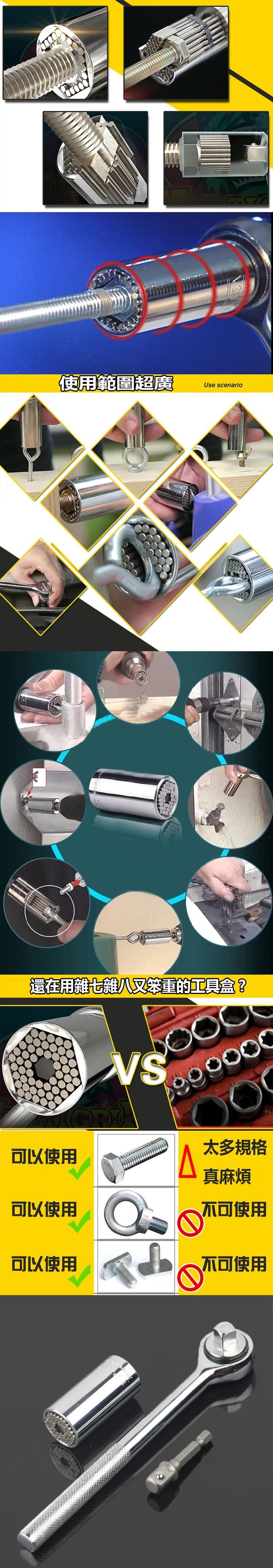 市面上有些造型特殊的螺絲,往往找不到適合的工具輔助使用,就讓萬用套筒扳手豪華組來解救你,可隨身攜帶超方便!可適用各種不規則形狀的零件,無論是圓型的螺栓、非六角的螺絲、吊環、吊勾、蝶型螺母等特殊五金都可以搞定!