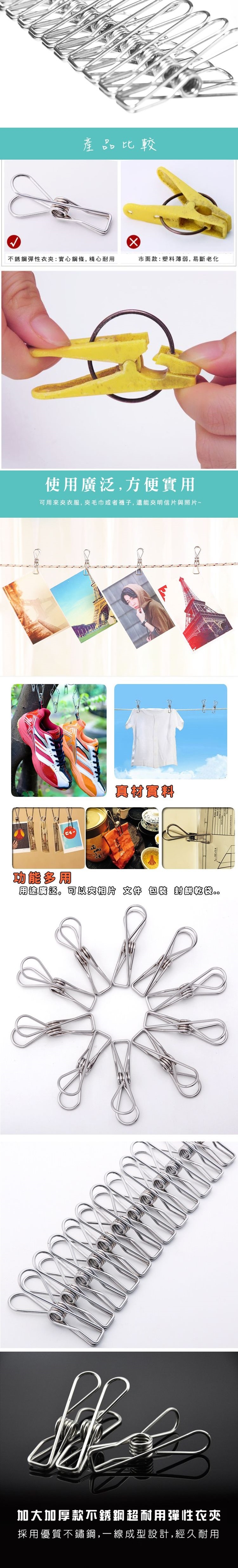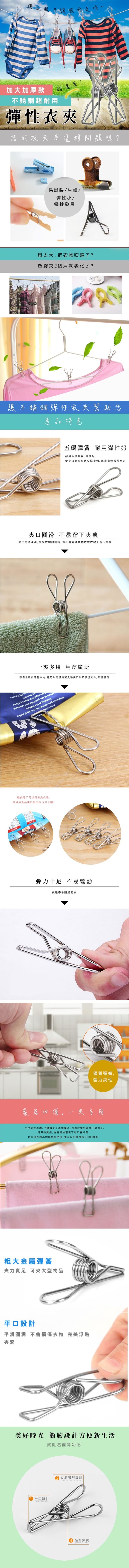 傳統衣夾時常風吹雨淋,風化脆化不耐用! 加大加厚款不銹鋼超耐用彈性衣夾,無細縫,經久耐用!彈力不退化,當文件夾也可以喔!不生鏽,不怕弄髒衣物!牢牢夾緊衣服,不怕風吹衣物落地弄髒! 目前市售最大最厚款 ,加大加厚 還降價