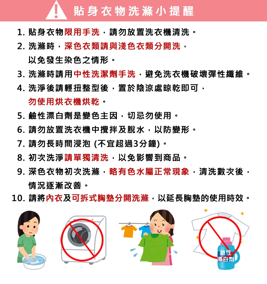 2. 洗滌時請用中性洗潔劑手洗,避免洗衣機破壞彈性纖維。