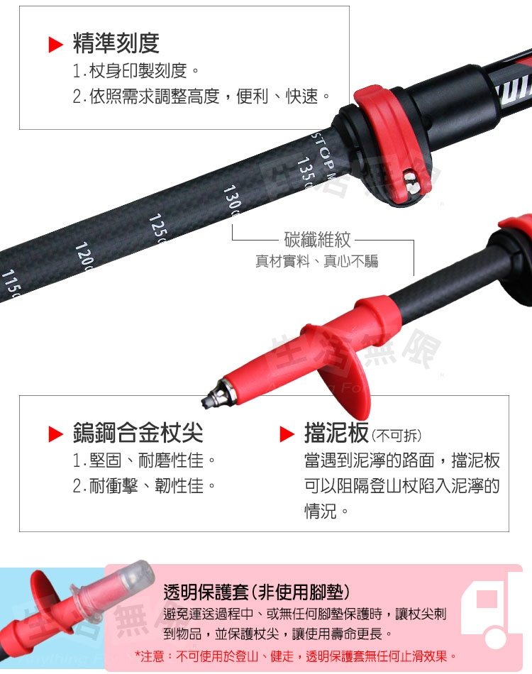 2.手杖除了做健走、徒步及登山用之外,請勿作為其他用途。