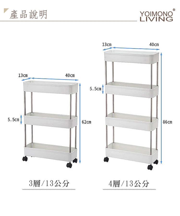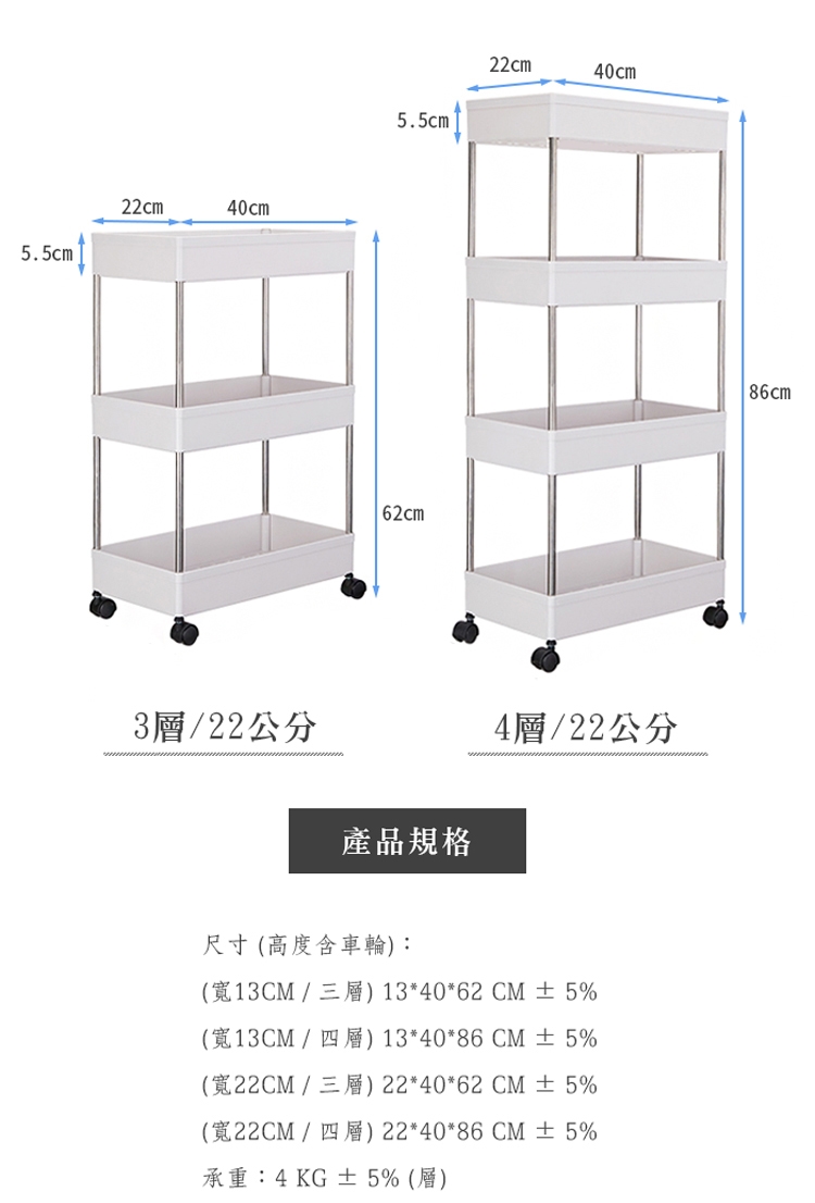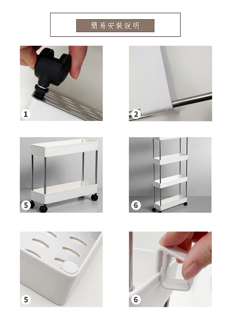 一. 網頁圖片因拍攝關係會與實際商品略有色差,顏色以實際收到商品為準。br/二. 退貨需保持商品本體包裝完整性,試用後恕無法接受退換貨。br/三. 購買時請特別注意商品的「尺寸」符合需求再行訂購。br/四. 因測量方式不同可能與標示會略有差距, ± 5%內屬正常範圍。br/五. 禁止攀爬,超過承重可能會導致本產品車輪無法運行或毀損倒塌危及身命安全。br/六. 車輪無剎車功能,架身為窄高型請使用雙手推動避免移動時傾倒。 br/七. 架身為窄高型,建議放置於大型傢俱之間隙縫來置放避免傾倒。br/八. 避免安裝過程受傷,請配戴手套。(禁止兒童安裝)br/九. 若需直接搬運請由產品底部抬起,避免鋼管掉落。