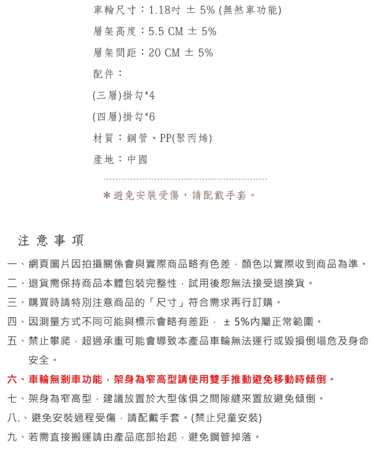 一. 網頁圖片因拍攝關係會與實際商品略有色差,顏色以實際收到商品為準。br/二. 退貨需保持商品本體包裝完整性,試用後恕無法接受退換貨。br/三. 購買時請特別注意商品的「尺寸」符合需求再行訂購。br/四. 因測量方式不同可能與標示會略有差距, ± 5%內屬正常範圍。br/五. 禁止攀爬,超過承重可能會導致本產品車輪無法運行或毀損倒塌危及身命安全。br/六. 車輪無剎車功能,架身為窄高型請使用雙手推動避免移動時傾倒。 br/七. 架身為窄高型,建議放置於大型傢俱之間隙縫來置放避免傾倒。br/八. 避免安裝過程受傷,請配戴手套。(禁止兒童安裝)br/九. 若需直接搬運請由產品底部抬起,避免鋼管掉落。
