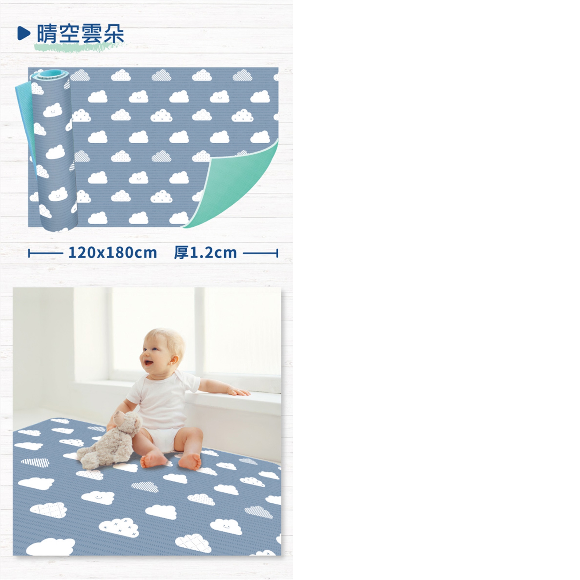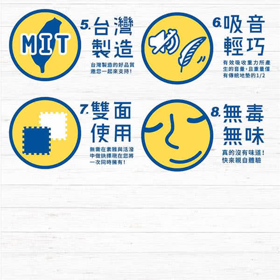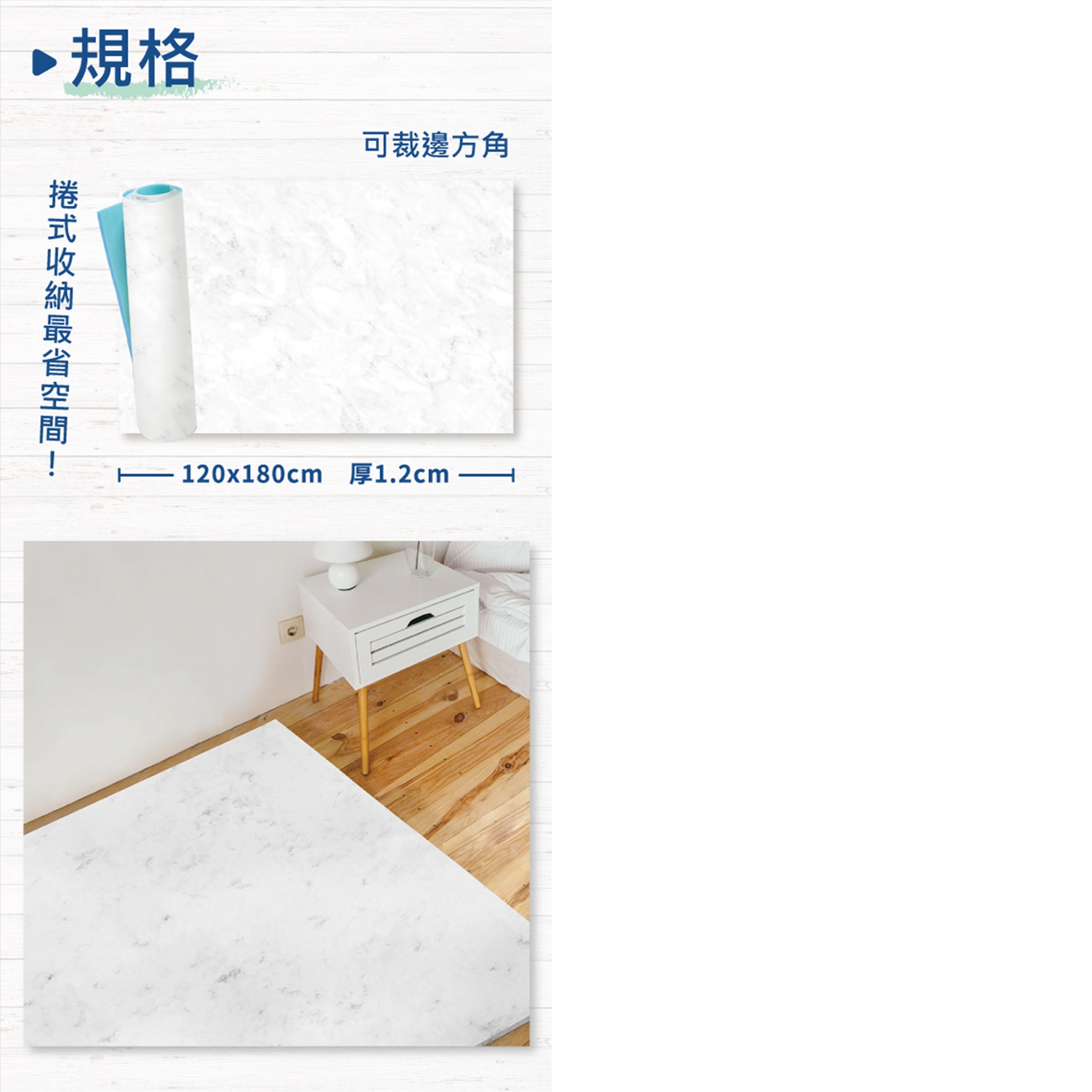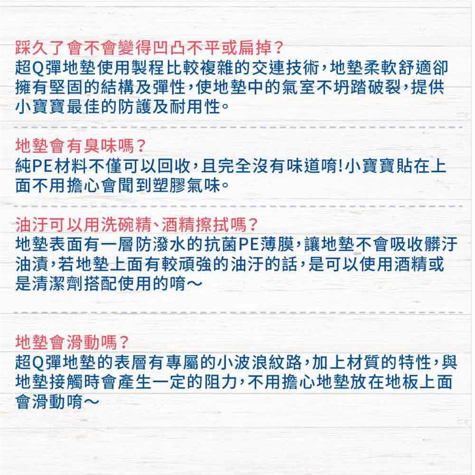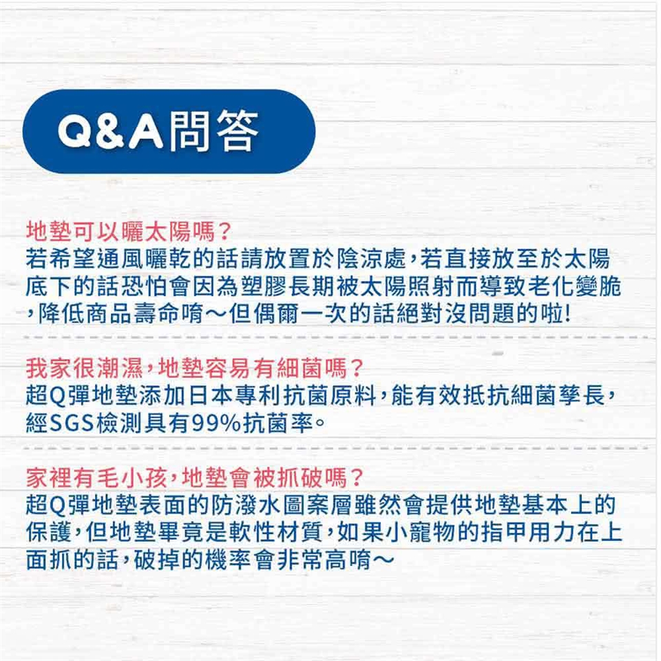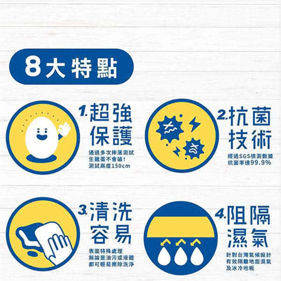 1.因為厚度較厚,故初次使用時,請您順著目錄上面標示的紋路方向反捲起來,靜置約一分鐘後再攤開使用,即可大幅恢復平整度。(如果您購買的是巧拼款的地墊則可跳過此步驟)