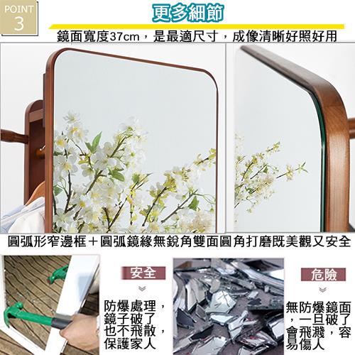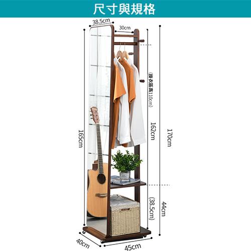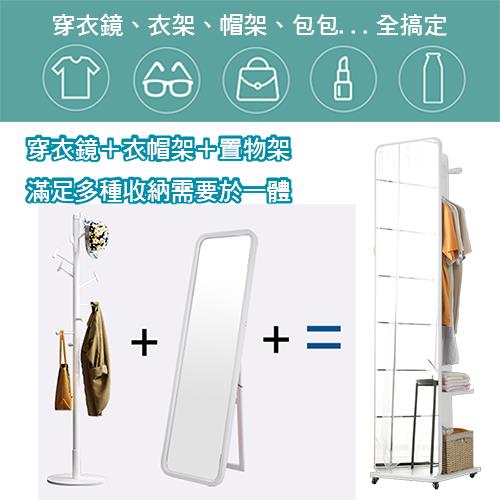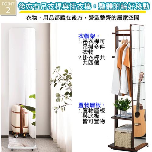 前後都可以使用是本商品最大的特色,正面是經過雙面圓角打磨的圓弧窄邊框並搭配最好用的大鏡面落地穿衣鏡,後方有加粗的實木吊衣桿與置物層板、兩側也有各兩支實木掛衣桿,將穿衣鏡與衣帽架和置物板結合,真的超實用。