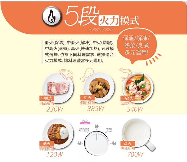 ◎5段火力模式:低火(保溫),中低火(解凍),中火(悶燉),中高火(烹煮),高火(快速加熱)