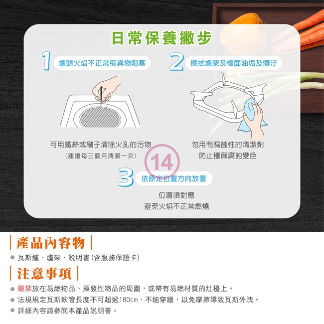 (二)、擦拭爐架及檯面油垢及髒汙:勿用有腐蝕性的清潔劑,防止檯面腐蝕變色