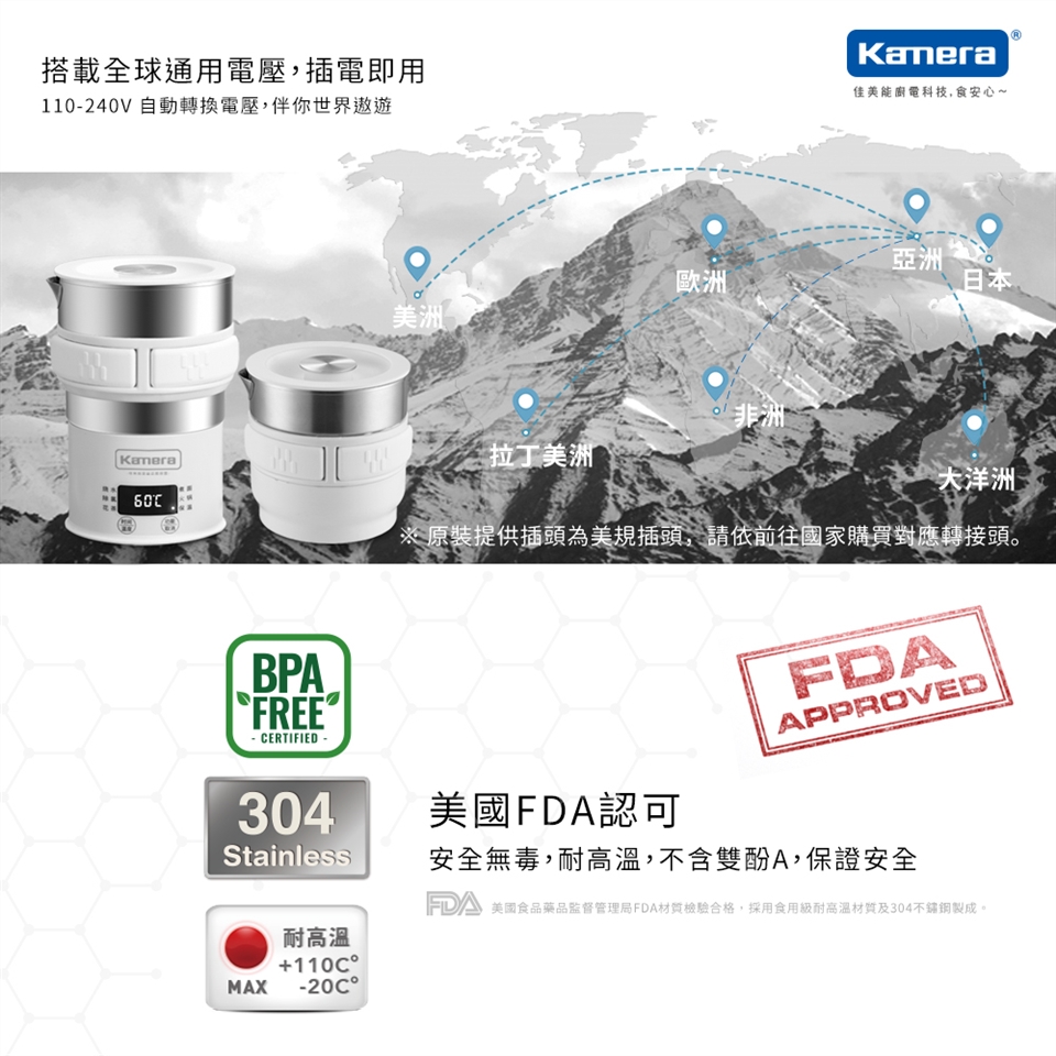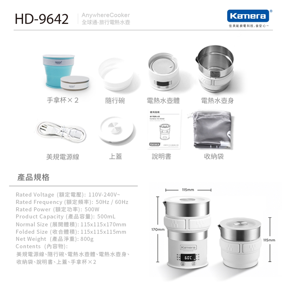※運送中,紙箱可能會壓到或擦傷,並不影響內部商品完整性,會在意請斟酌後再行購買。Kamera 旅行電熱水壺 (HD-9642)產品特色