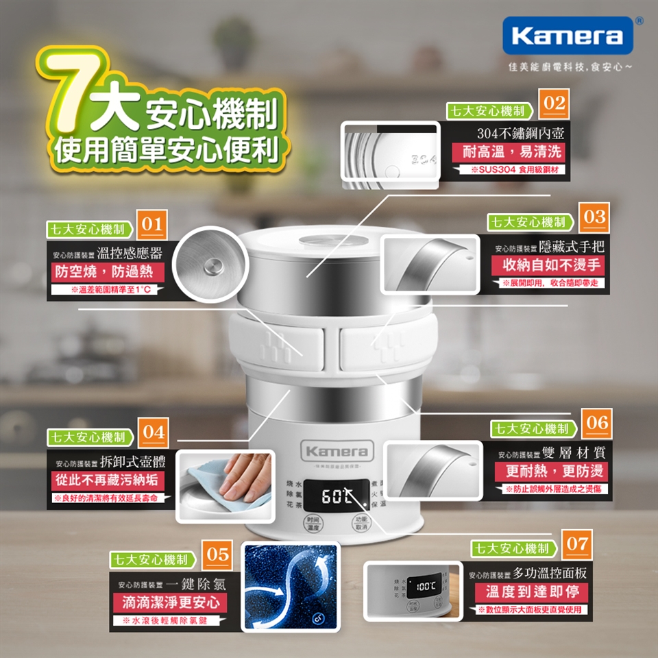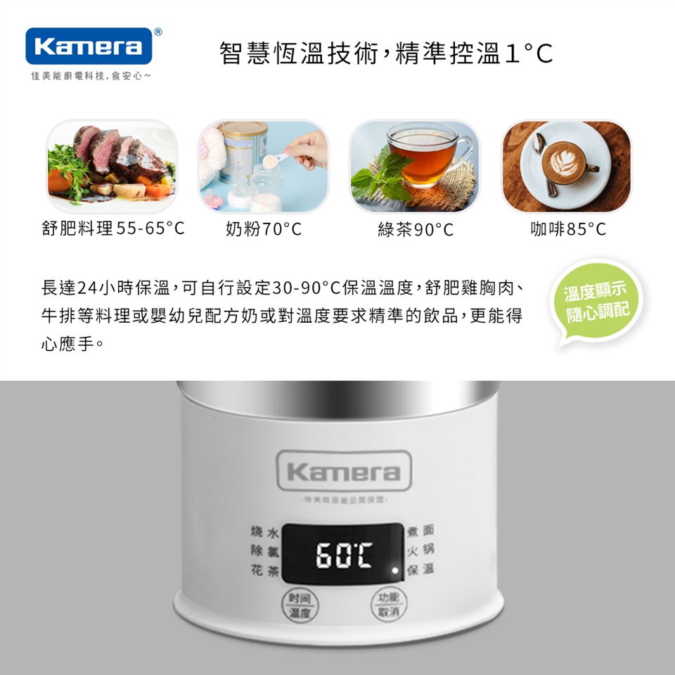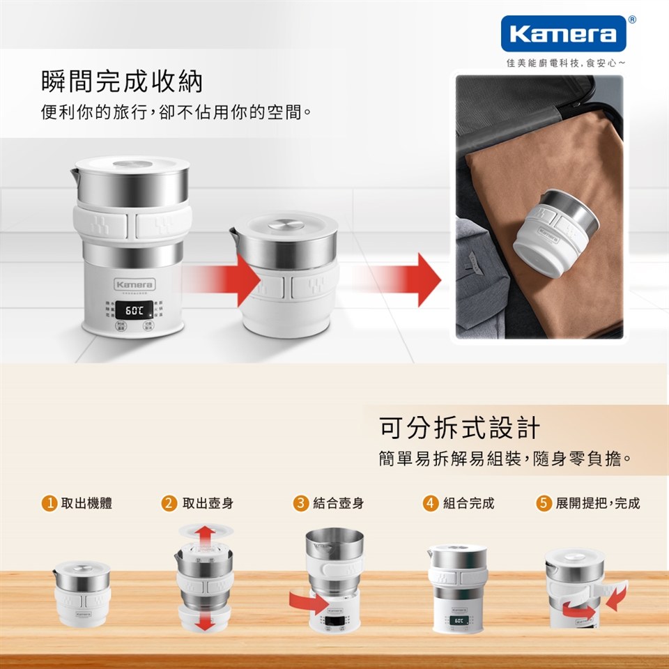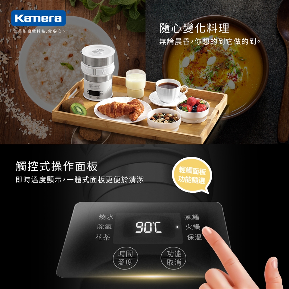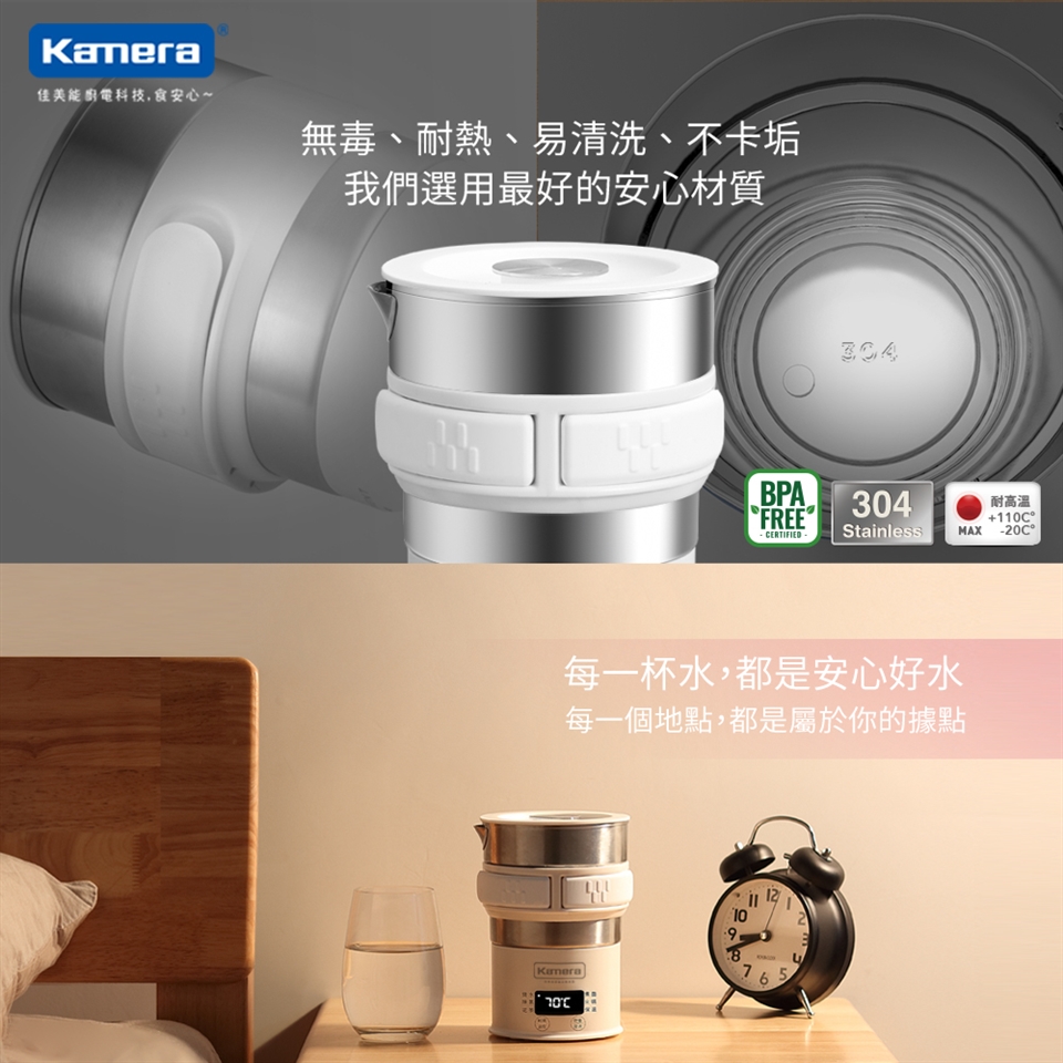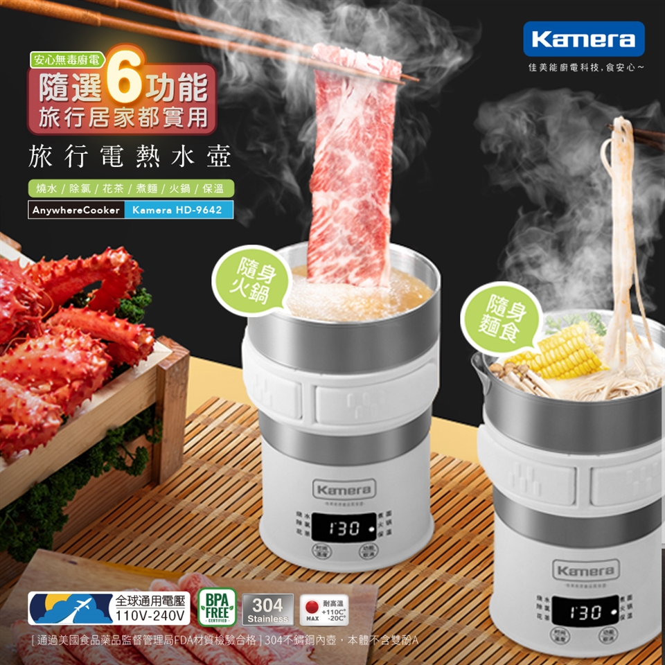 Kamera 旅行電熱水壺不單單只是一般電熱水壺,它兼具了燒水、除氯、花茶、煮麵、火鍋、保溫六大功能,滿足您的各種需求;尤其常常我們出門在外,想喝溫開水、半夜肚子餓想吃泡麵、起床想沖泡一杯咖啡提神…等等;卻常常因為不安心使用飯店所提供的電熱水壺而作罷,而傳統電熱水盒體積龐大又讓人不好自行攜帶;Kamera 旅行電熱水壺可拆式的設計讓您收納簡單且方便攜帶,並提供110-240V全球性通用電壓;除了居家使用的便利性,更是您出遊的好夥伴。