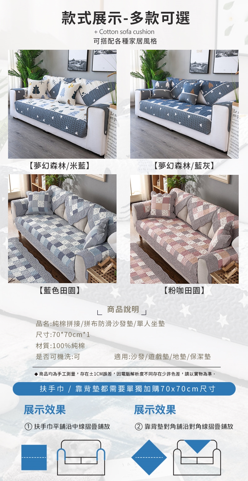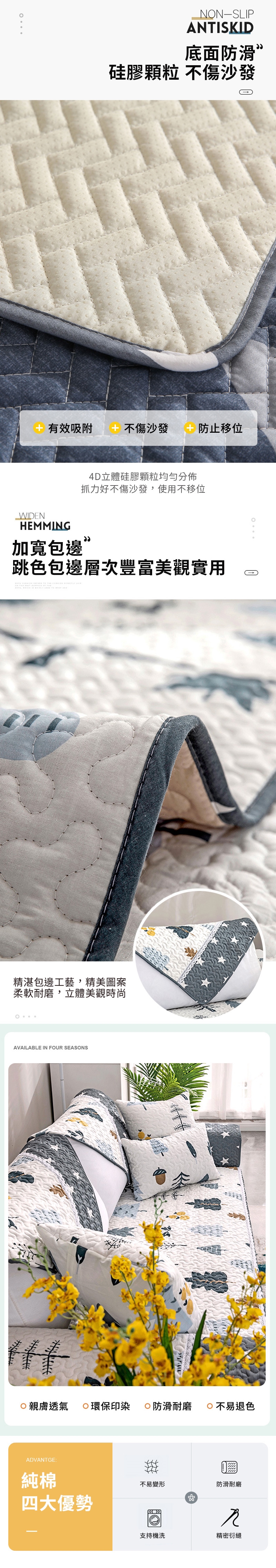 100%純棉面料製成,精選親膚純棉面料,透氣吸濕,冬暖夏涼四季皆適用,放上沙發墊後可延長沙發使用壽命,