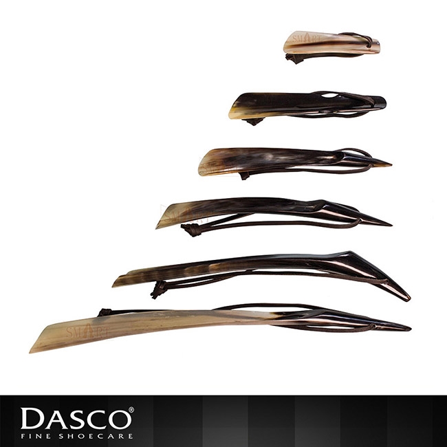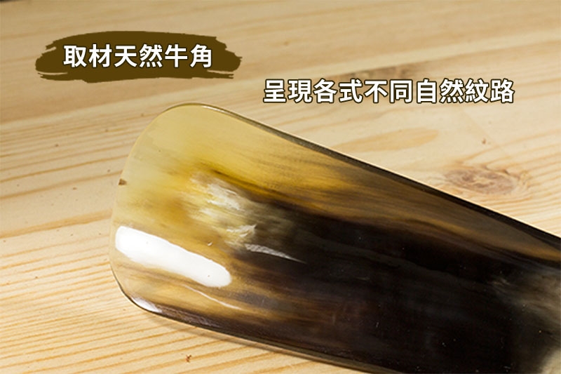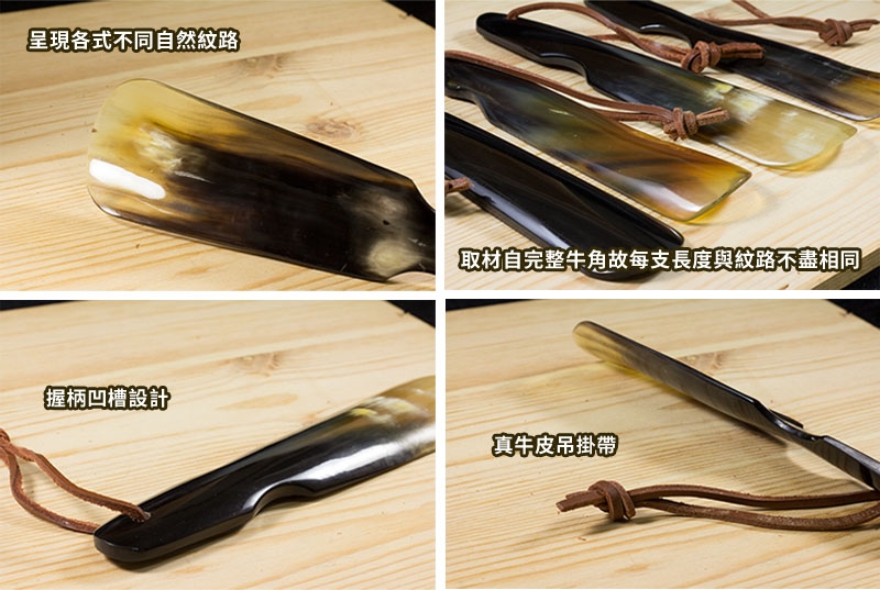 因取材自完整牛角,故每支長度不盡相同,附皮革吊掛。
