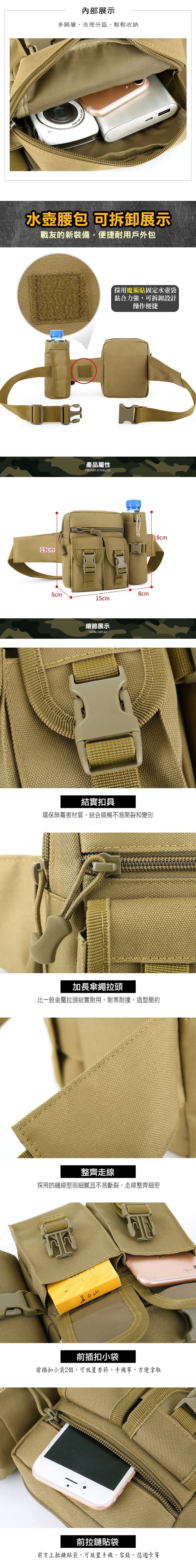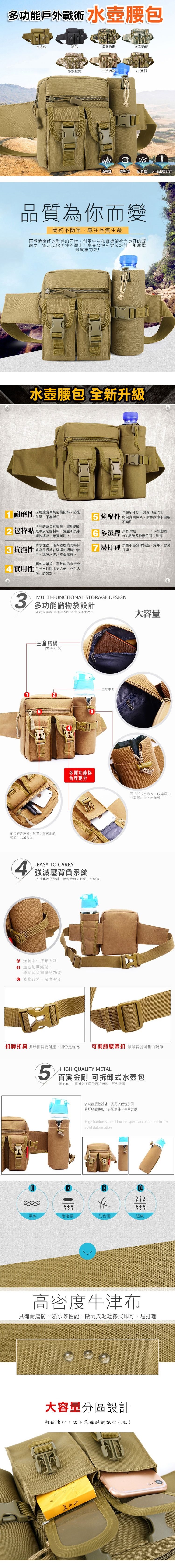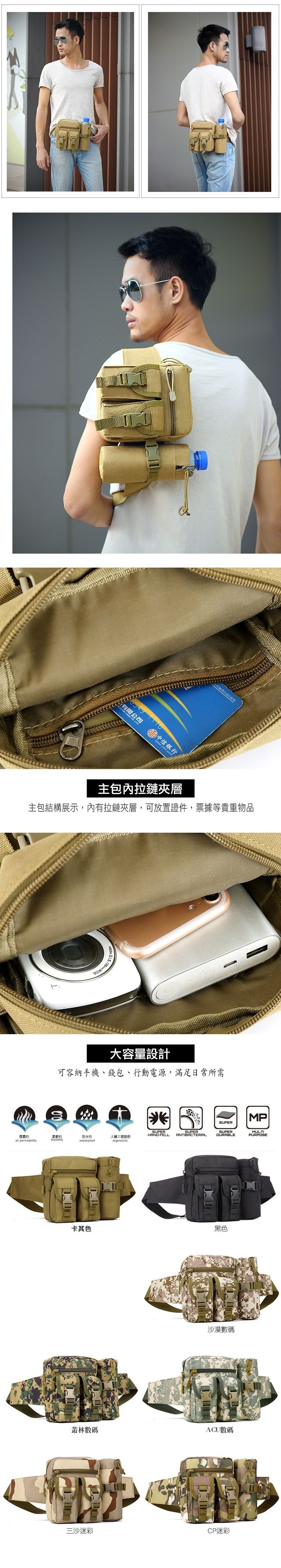 精簡外出收納,運動、健行、野營的方便配備!多功能戶外戰術水壺腰包, 今年新升級加大款、款式更多更齊 耐用,可收放平板、行動電源、手機、雨傘、錢包等隨身物品,雙邊收納可放水瓶或雨傘等物品,將最緊要的物品帶在身邊,輕裝出行更自在!